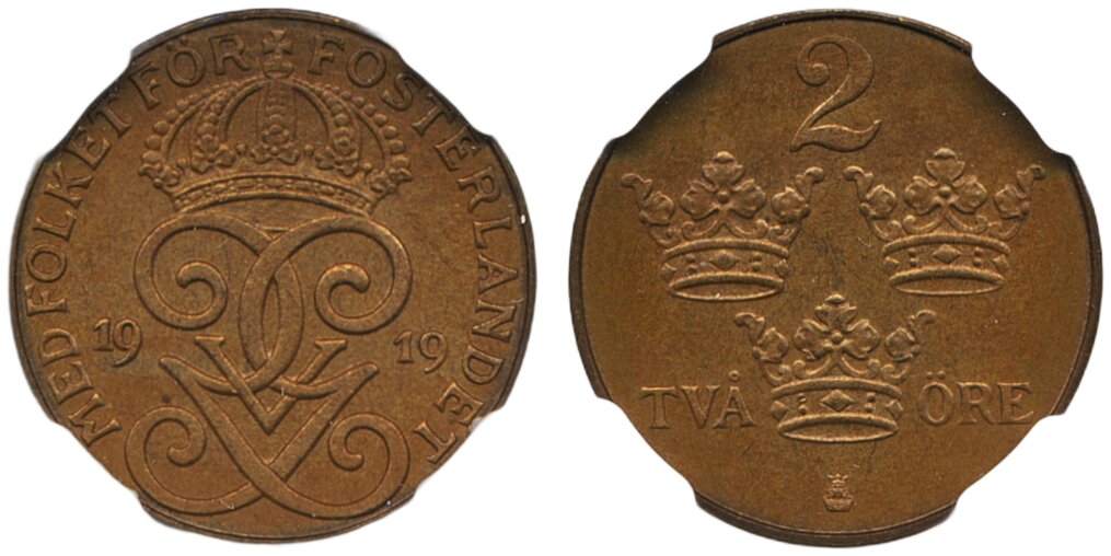 Coins, Sweden. Gustav V, MIS I.8, 2 öre 1919. Graded MS65 BN by NGC. 01/0. See certification at NGC