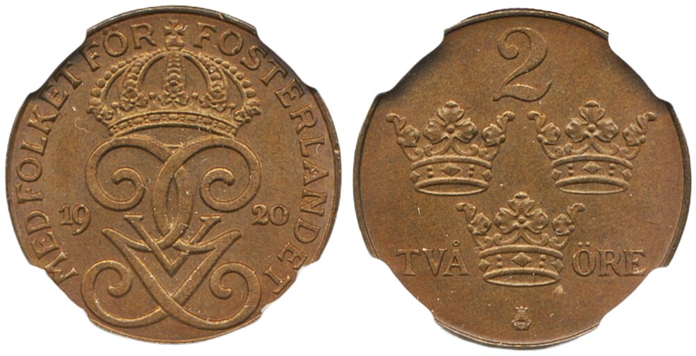 Coins, Sweden. Gustav V, MIS I.9b, 2 öre 1920. Graded by NGC as MS65 BN. 01/0. See certification at NGC