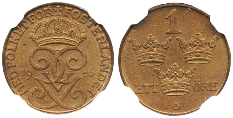 Coins, Sweden. Gustav V, MIS I.8b, 1 öre 1916. Long 6. Graded by NGC as MS64 BN. 01/0. See certification at NGC