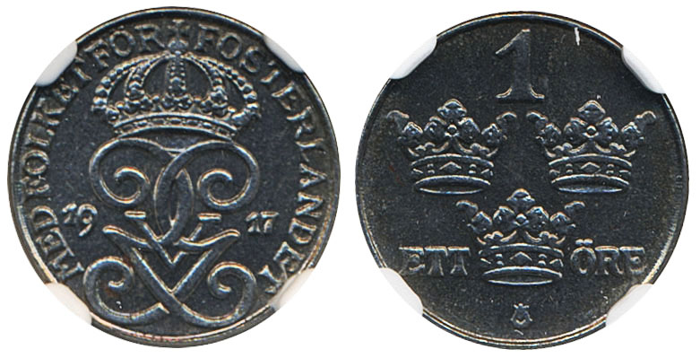 Coins, Sweden. Gustav V, MIS II.1, 1 öre 1917. Graded by NGC as MS64. 01/0. See certification at NGC