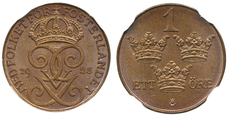 Coins, Sweden. Gustav V, MIS I.15, 1 öre 1925. Graded MS65 BN by NGC. 01/0. See certification at NGC
