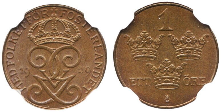 Coins, Sweden. Gustav V, MIS I.19a, 1 öre 1929. Curved 2. Graded MS65 BN by NGC. 01/0. See certification at NGC