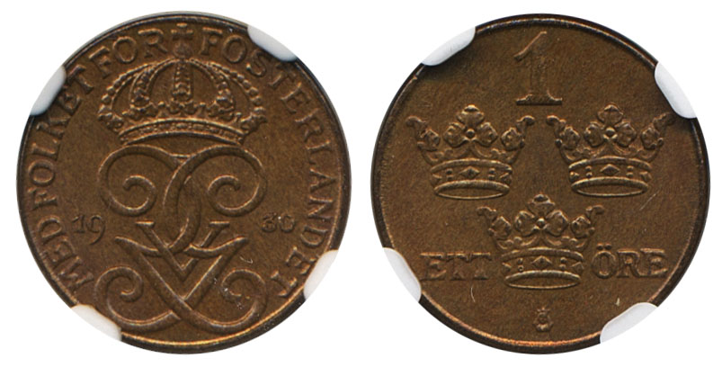 Coins, Sweden. Gustav V, MIS I.20, 1 öre 1930. Graded MS65 BN by NGC. Only two specimens graded higher by NGC. 01/0. See certification at NGC