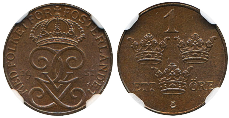 Coins, Sweden. Gustav V, MIS I.22, 1 öre 1931. Graded by NGC as MS65 BN. 0. See certification at NGC