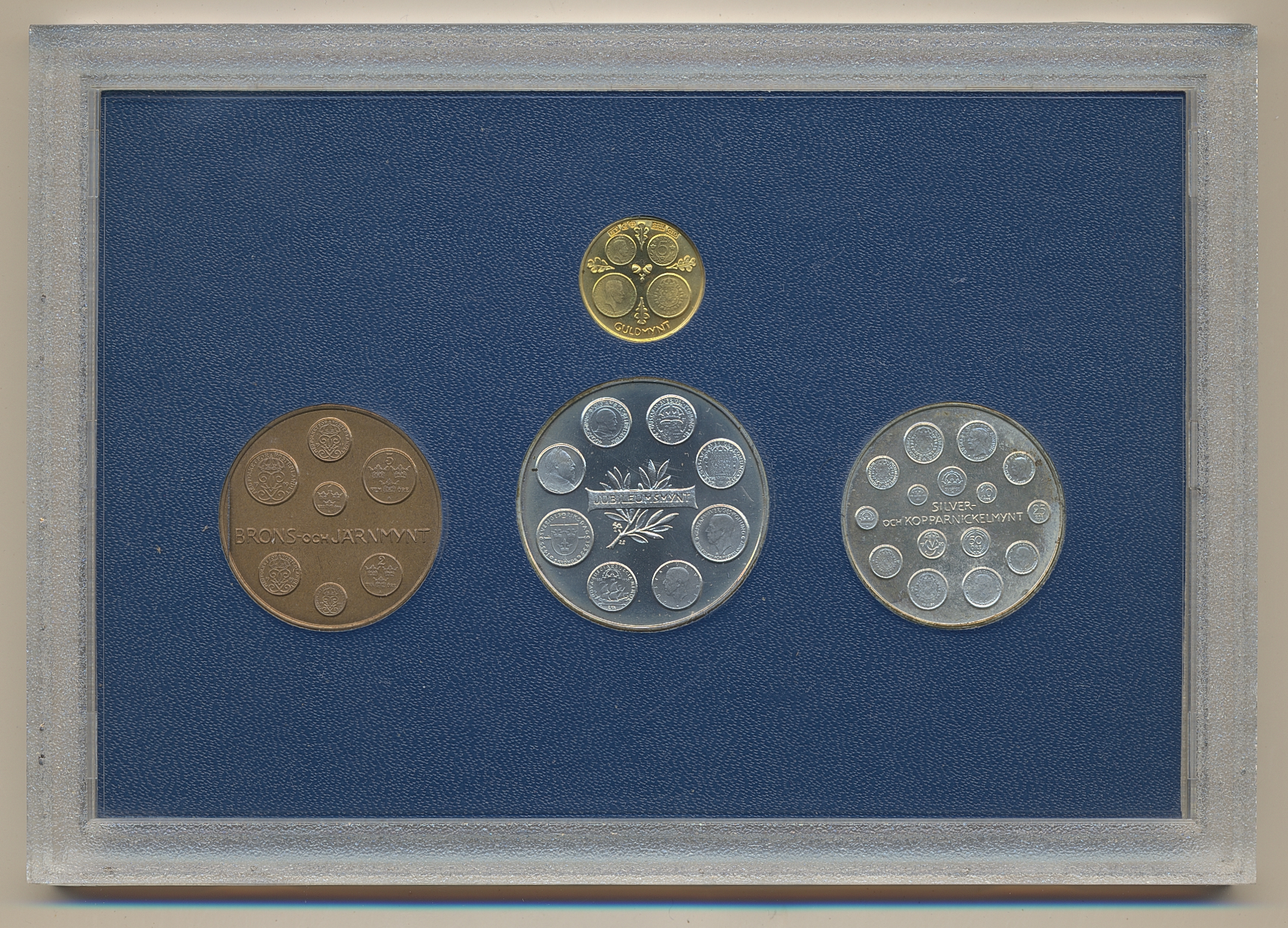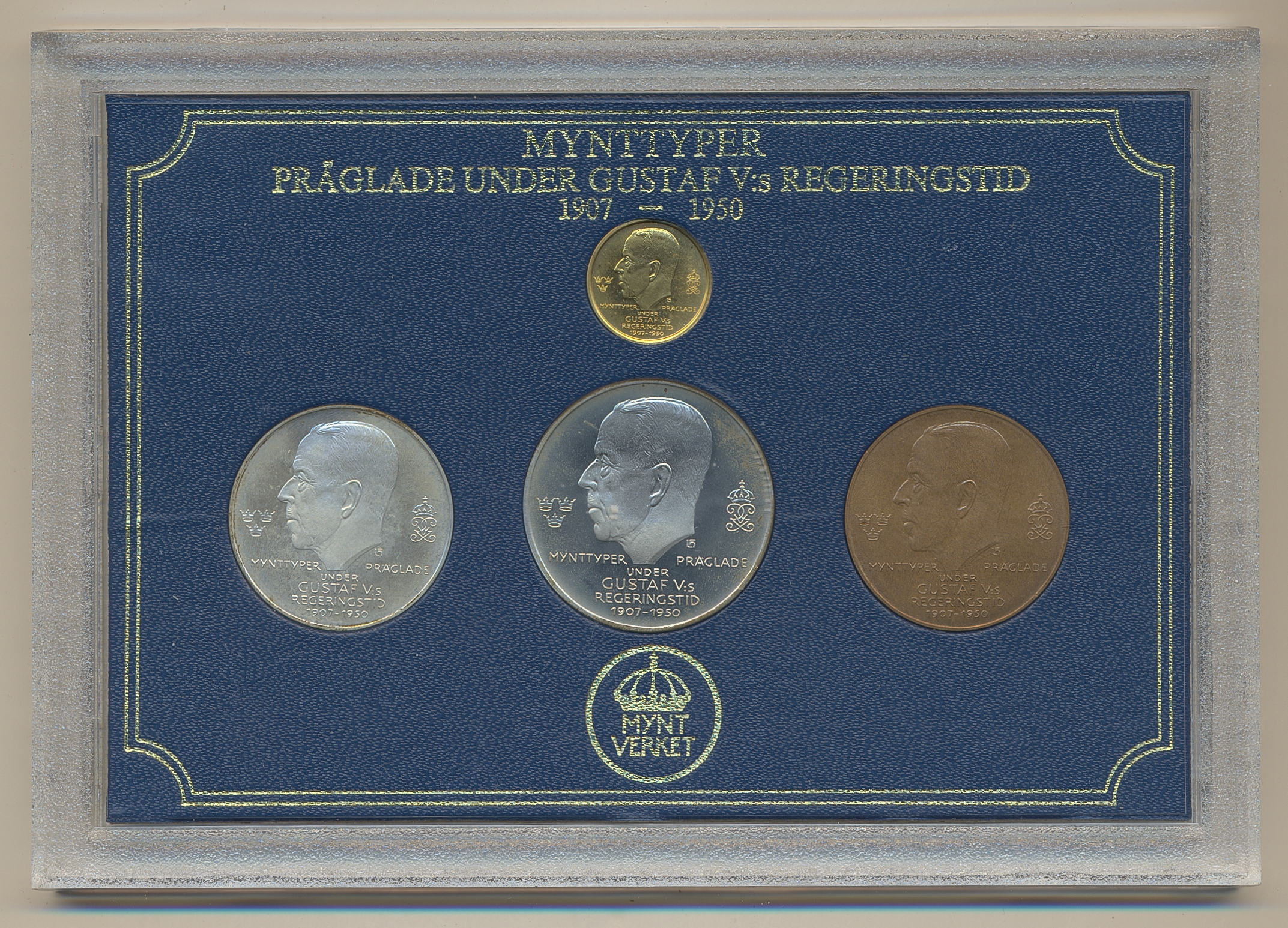 Medals, regal, Sweden. Gustav V, Medal set of gold medal (23 carat), two silver medals and bronze medal of coin types issued during Gustav V's reign. Issued by Swedish mint. 01/0.