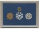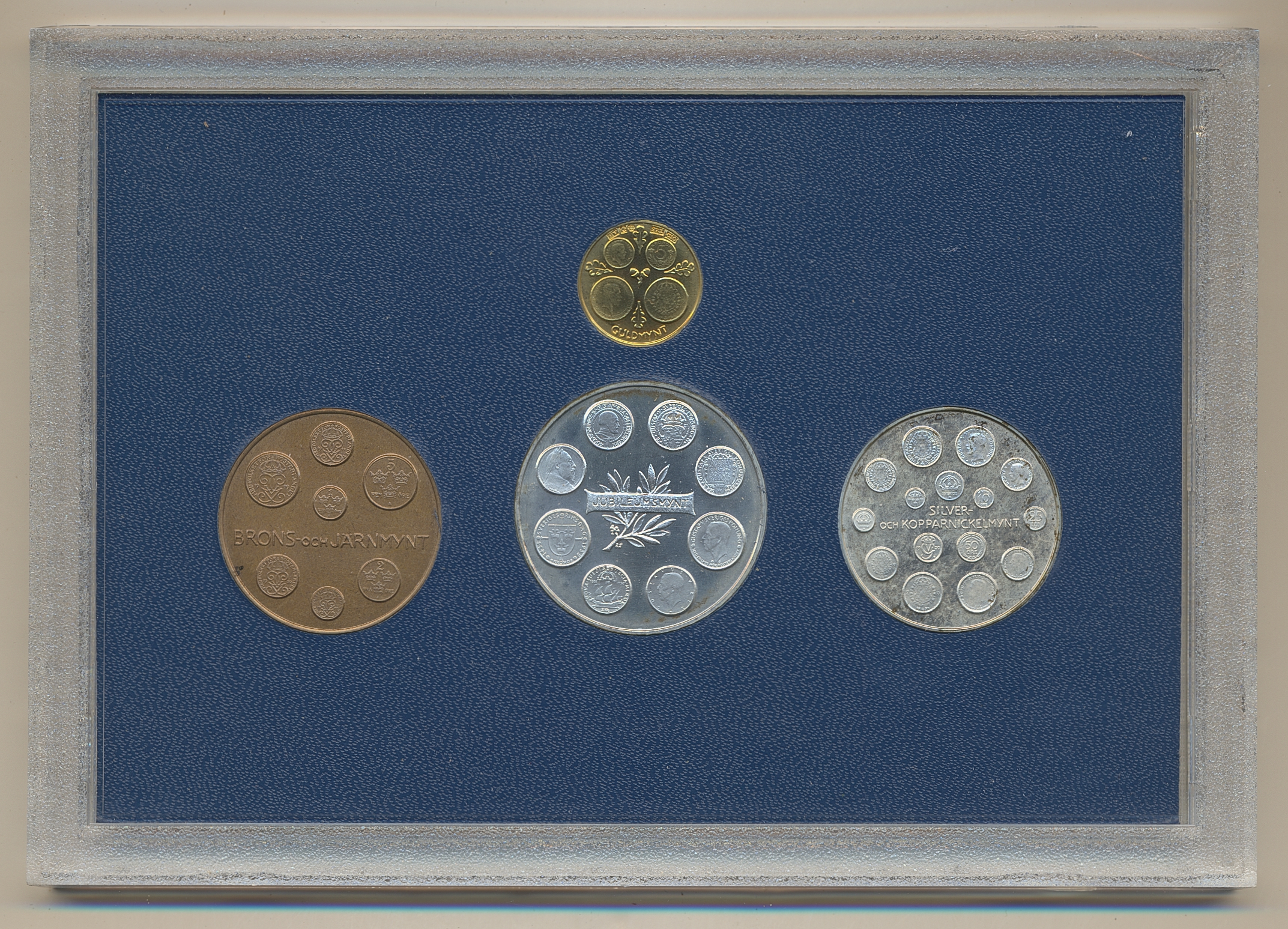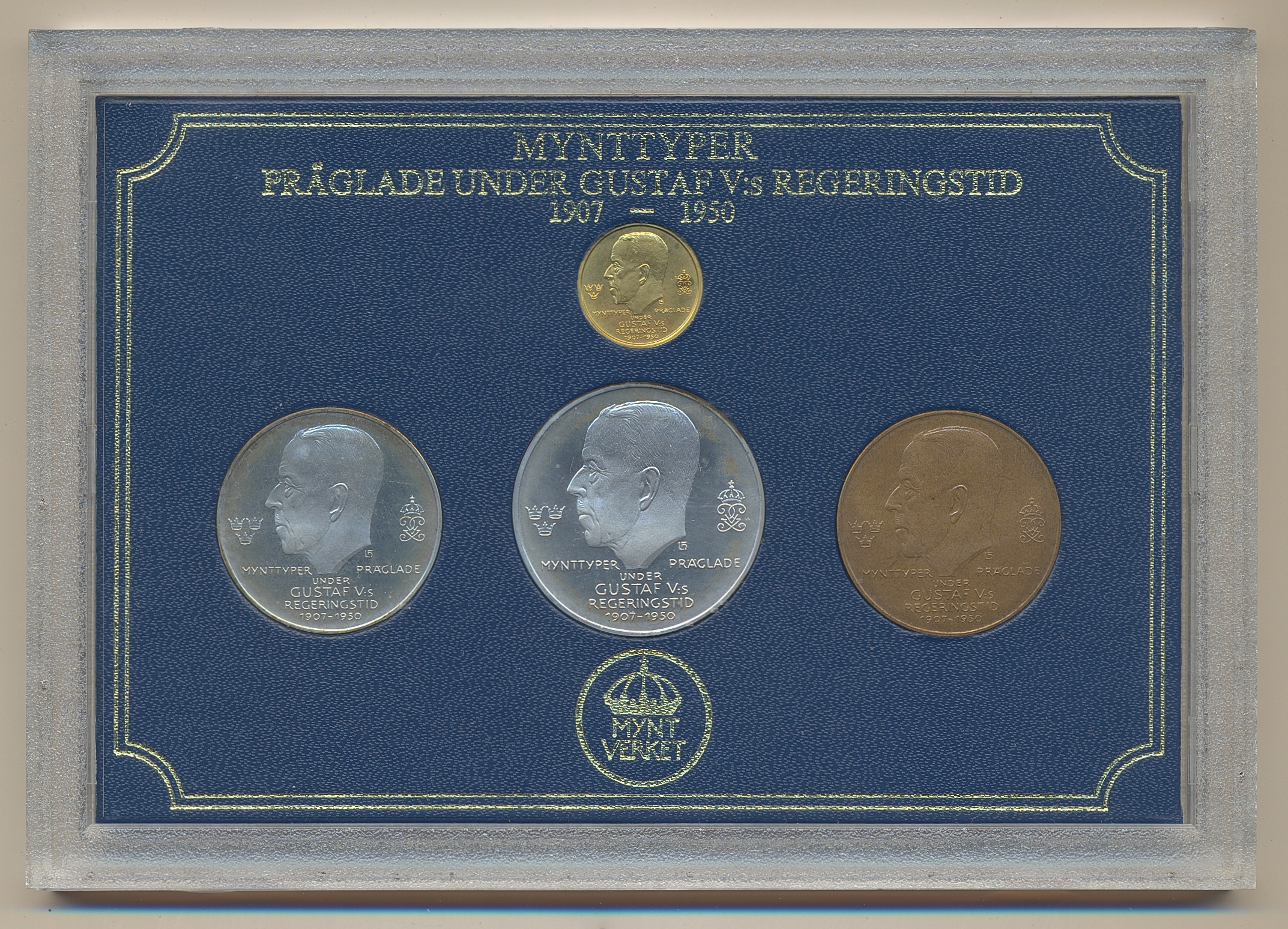 Medals, regal, Sweden. Gustav V, Medal set of gold medal (23 carat), two silver medals and bronze medal of coin types issued during Gustav V's reign. Issued by Swedish mint. 01/0.