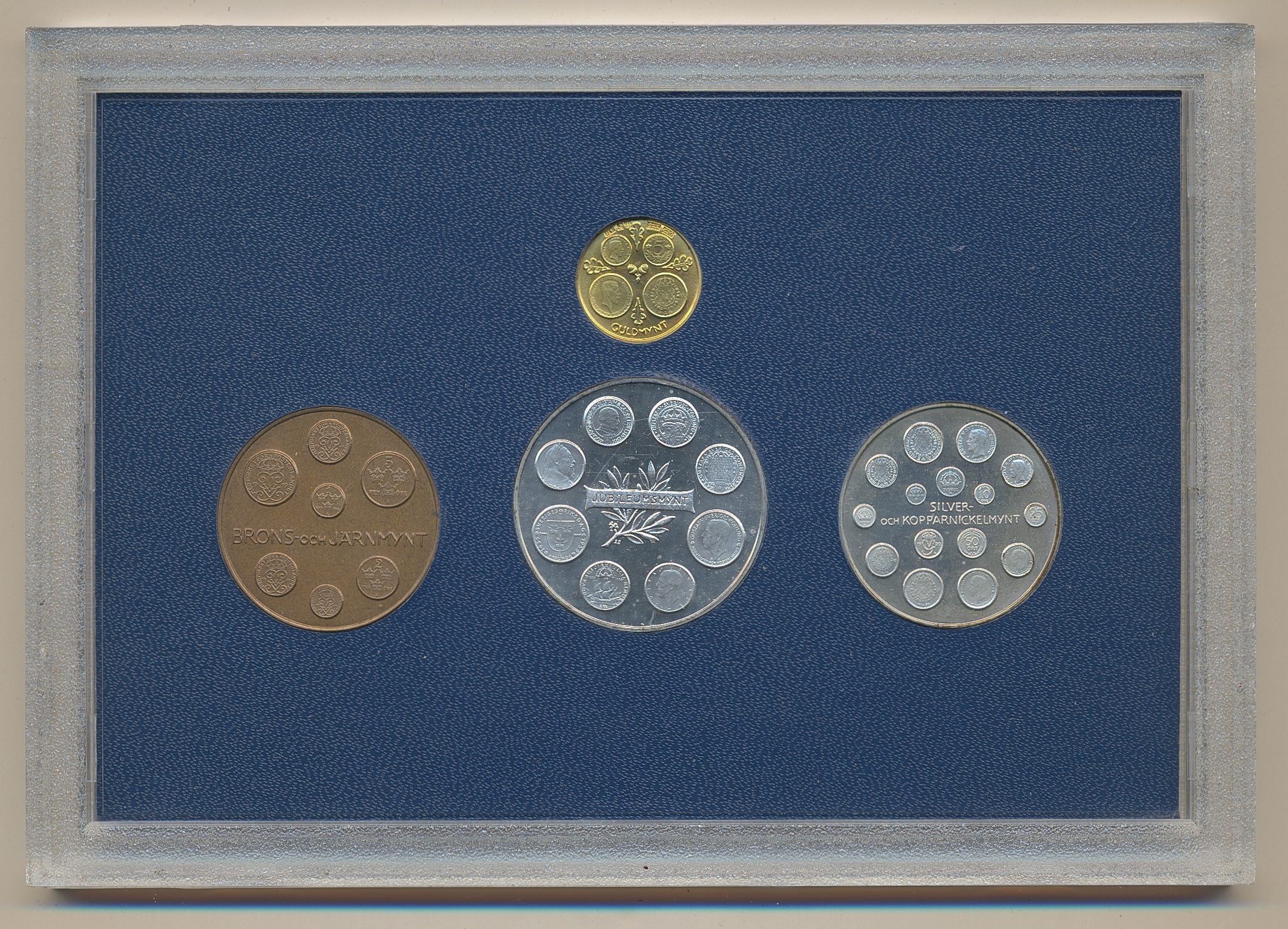 Medals, regal, Sweden. Gustav V, Medal set of gold medal (23 carat), two silver medals and bronze medal of coin types issued during Gustav V's reign. Issued by Swedish mint. 01/0.