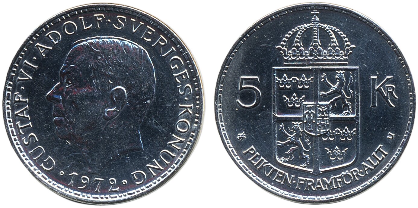 Coins, Sweden. Gustav VI Adolf, MIS VI.1a, 5 kronor 1972. Without lines behind lion. Superb example with reflective surfaces. 01/0.