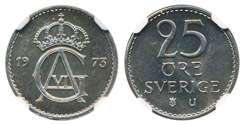 Coins, Sweden. Gustav VI Adolf, MIS II.12, 25 öre 1973. Graded by NGC as MS66PL. 0. See certification at NGC