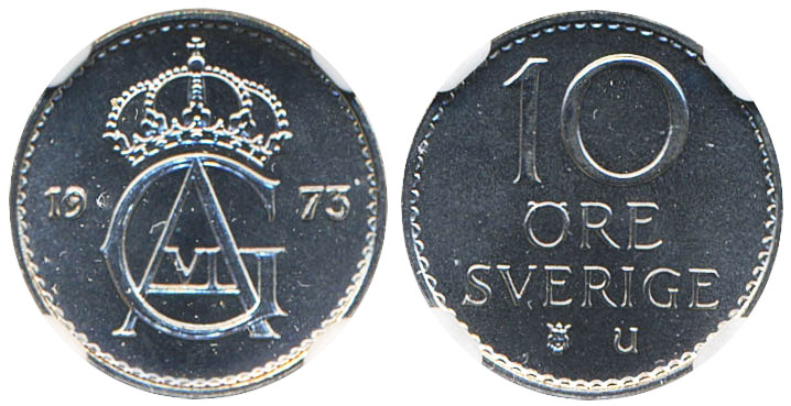 Coins, Sweden. Gustav VI Adolf, MIS II.12, 10 öre 1973. Graded by NGC as MS67PL. 0. See certification at NGC