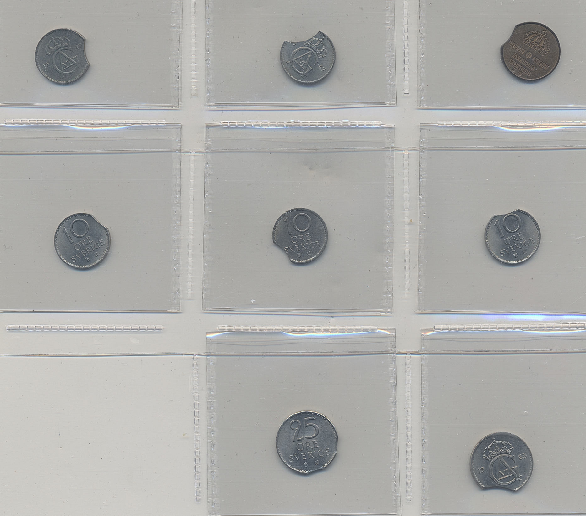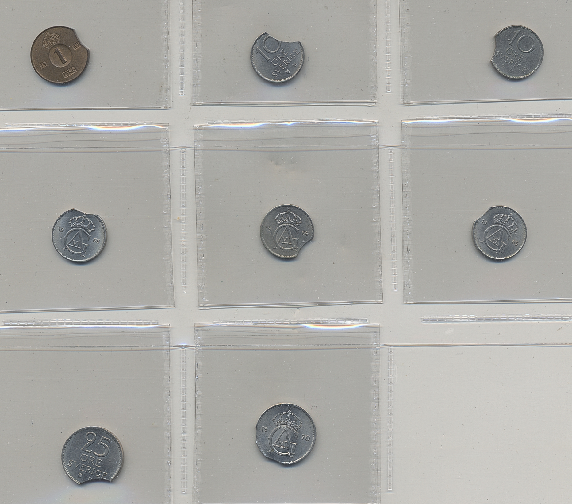Coins, Sweden. Gustav VI Adolf, Eight coins with mint errors, edge copies, 1 öre–25 öre, 1963–1970. 0.