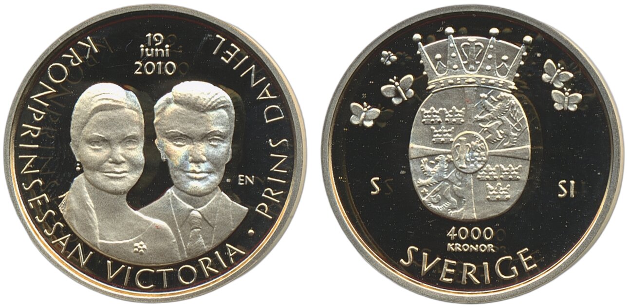 Coins, Sweden. Carl XVI Gustaf, SM 1, 4000 kronor i guld 2010. 12 g, The wedding between crown princess Victoria and Daniel Westling. 0. Mintage: 4370.