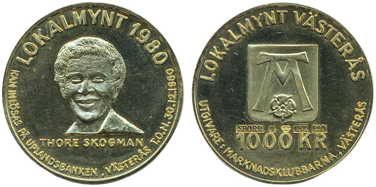 Coins, Sweden. Carl XVI Gustaf, 1000 kronor local coin 1980. 10.06 g, 18 K gold, Västerås 1000 kronor, Thore Skogman 1980. 01.