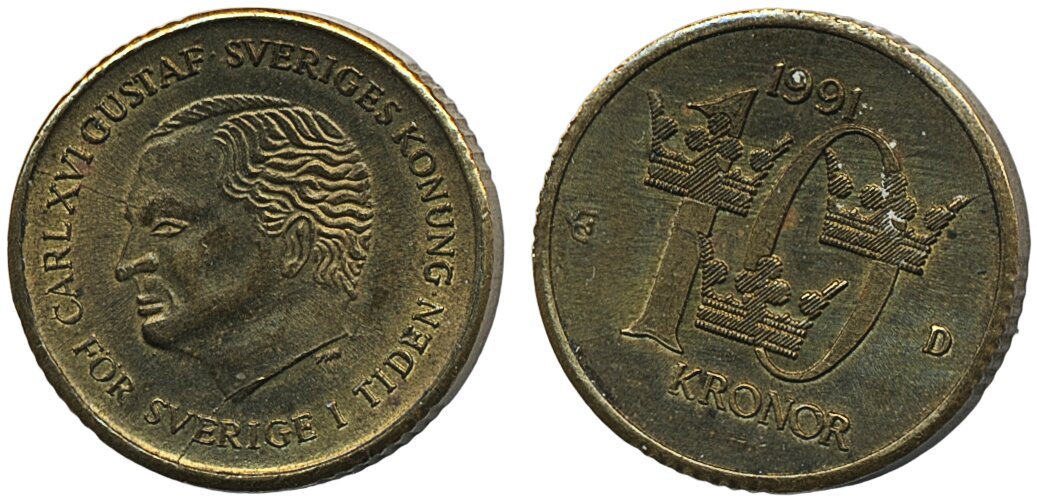 Coins, Sweden. Carl XVI Gustaf, MIS I.1a, 10 kronor 1991. Interesting forgery. Partially ribbed edge. Please note the King´s nose, eye and mouth! 1+.