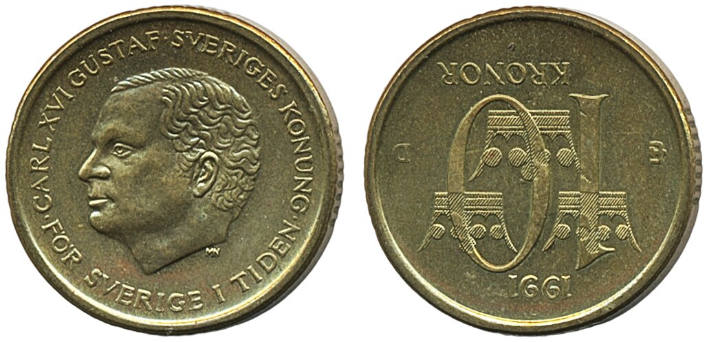 Coins, Sweden. Carl XVI Gustaf, MIS I.1b, 10 kronor 1991. Reverse rotated 180 degrees. 01/0.