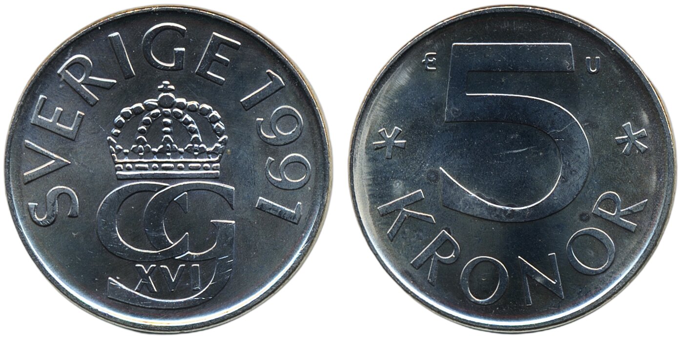 Coins, Sweden. Carl XVI Gustaf, MIS I.16, 5 kronor 1991. Mm U. Beautiful example with only the slightest handling marks. 01/0.