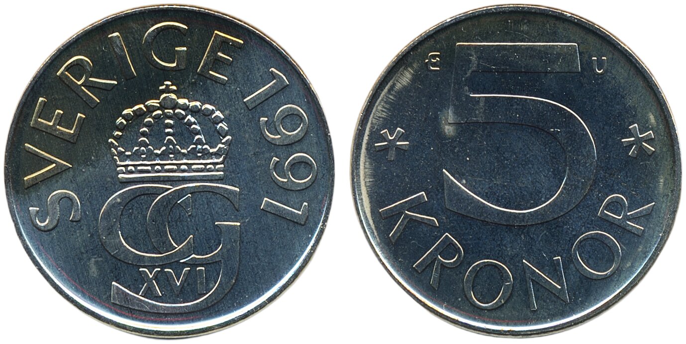 Coins, Sweden. Carl XVI Gustaf, MIS I.16, 5 kronor 1991. Mm U. 01/0.
