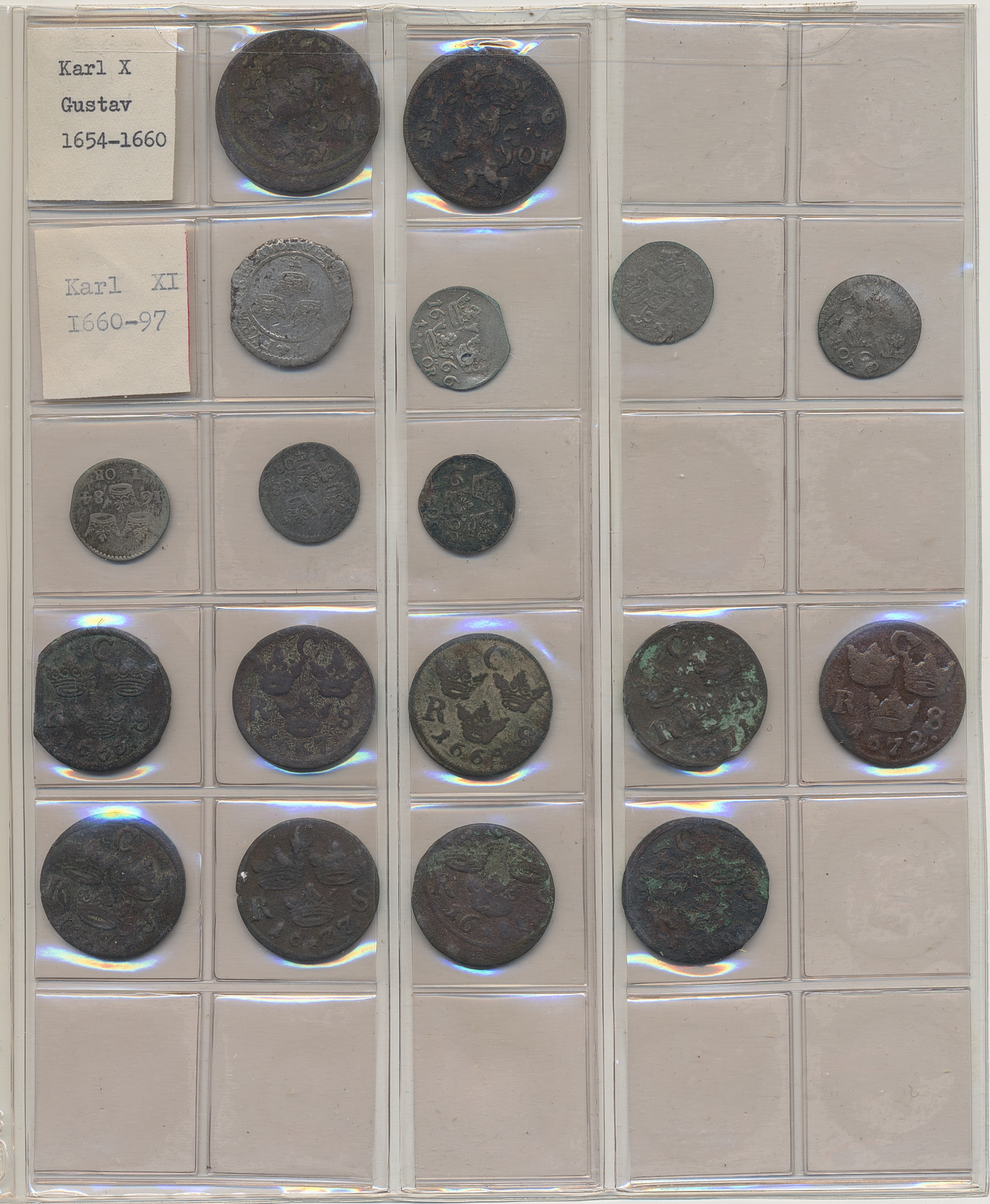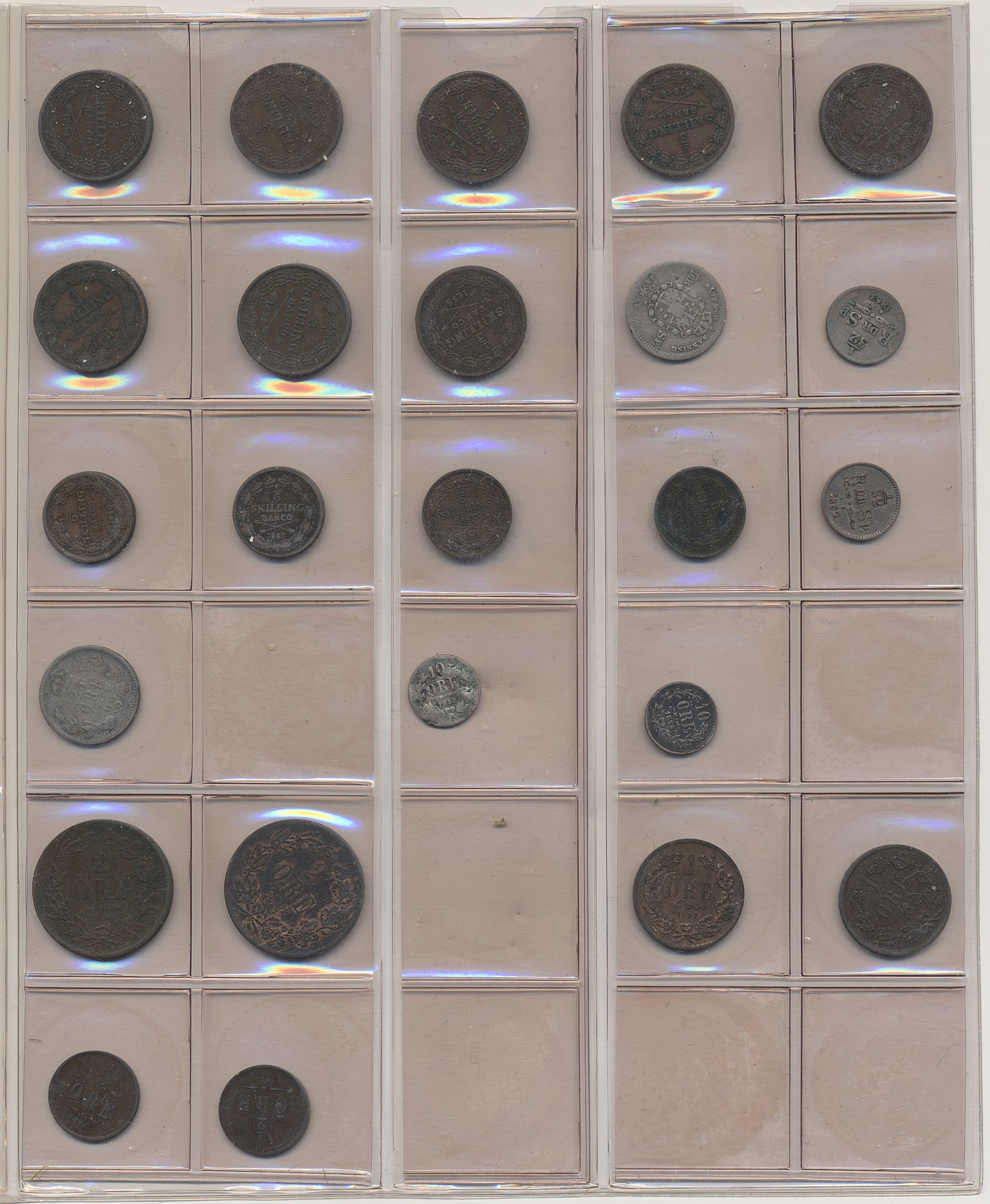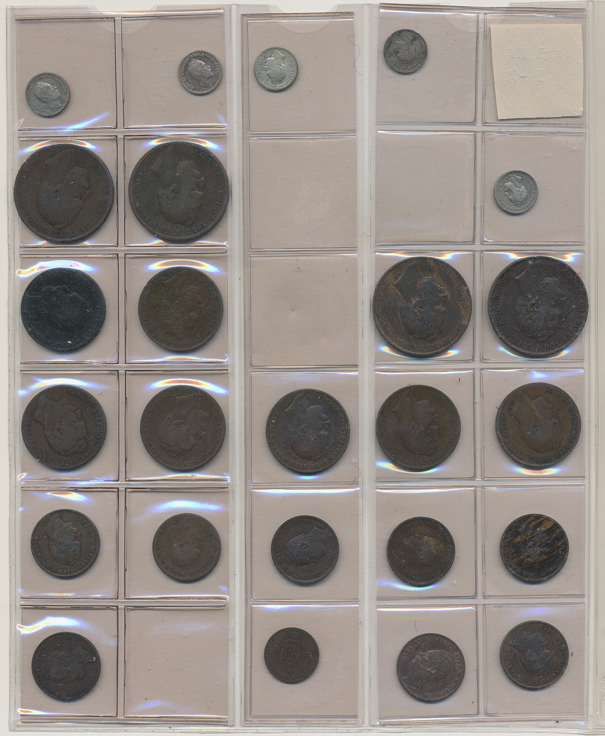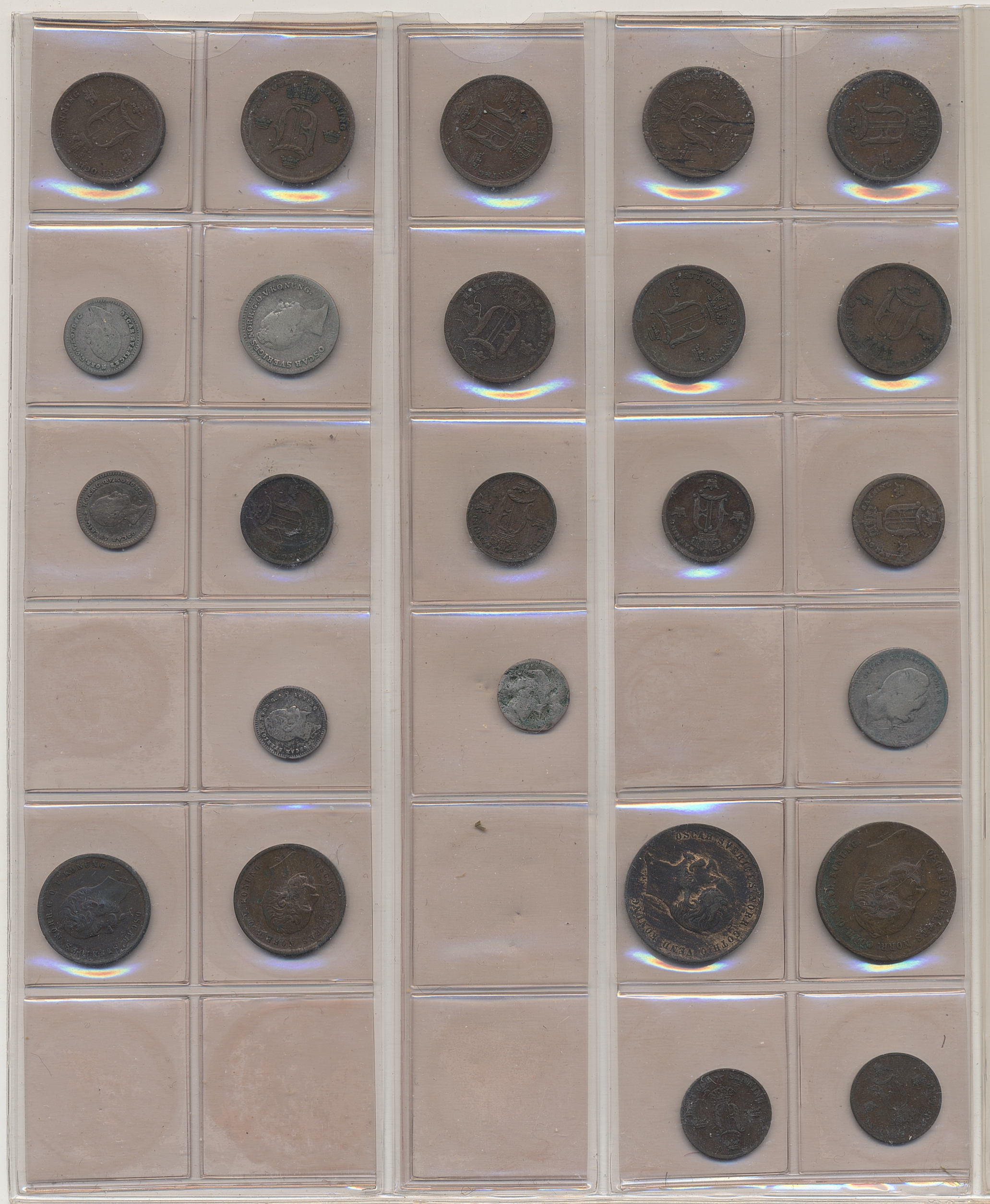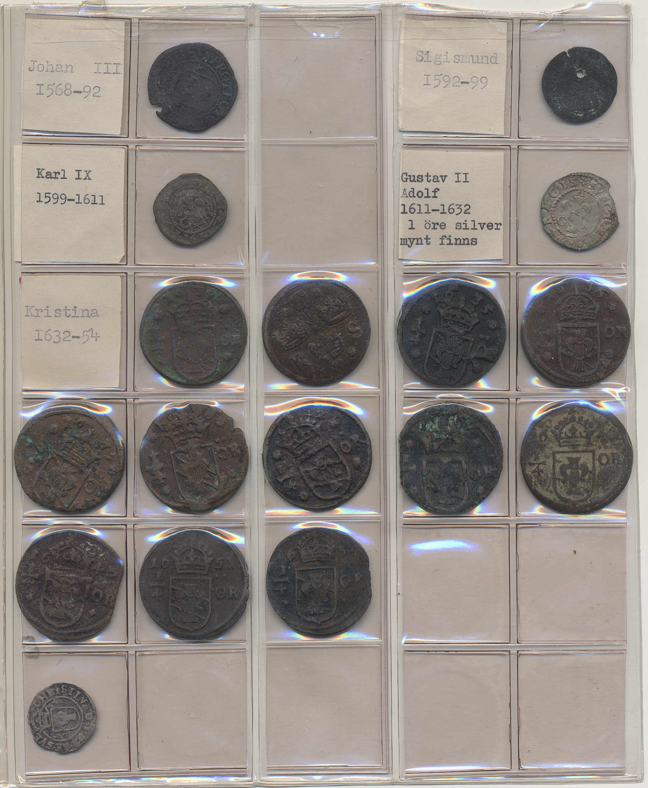 Coins, Sweden. Collection of mostly copper coins (but also some small denomination silvers) in album from Johan III to Carl XV. Please inspect! 2-1+.