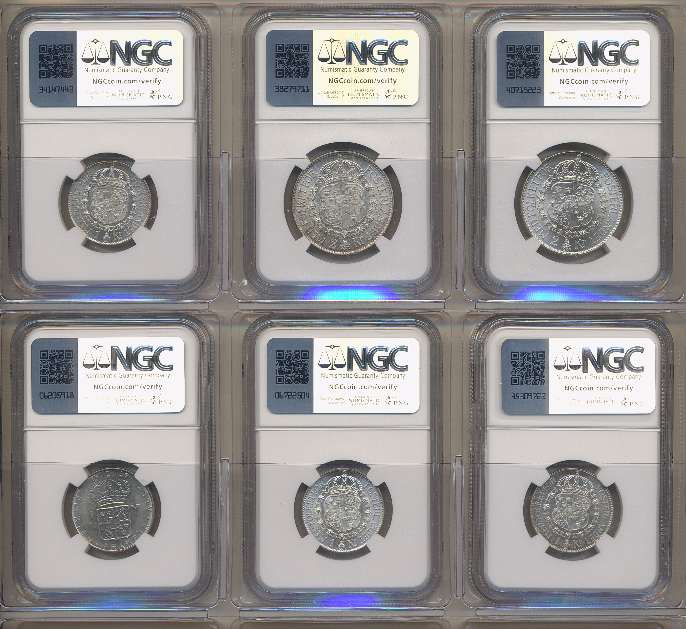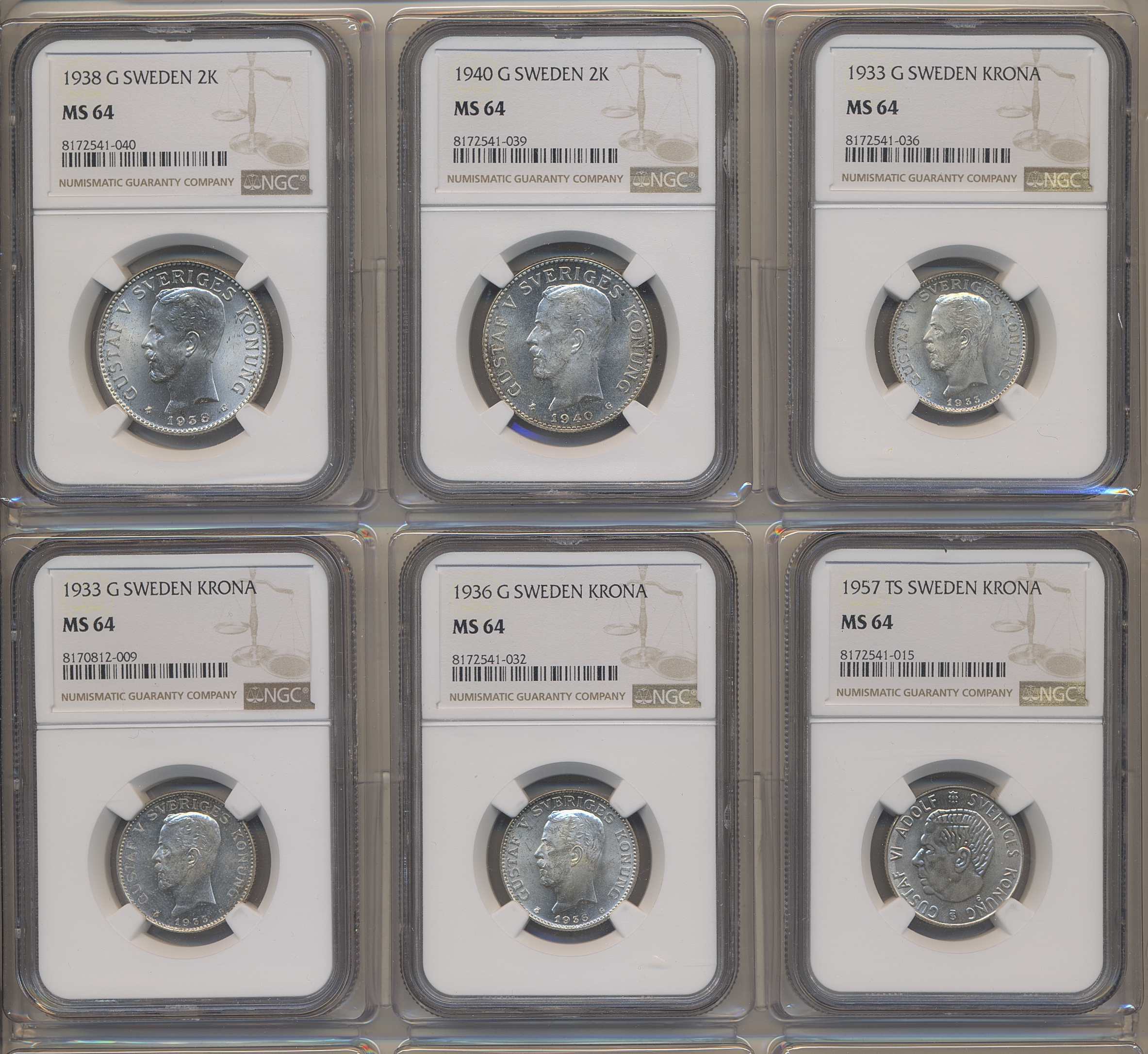 Coins, Sweden. Gustav V, 1–2 kr 1933–1940 and Gustav VI Adolf 1 kr 1957, in total six coins in higher grade MS64 in NGC holders. (6).