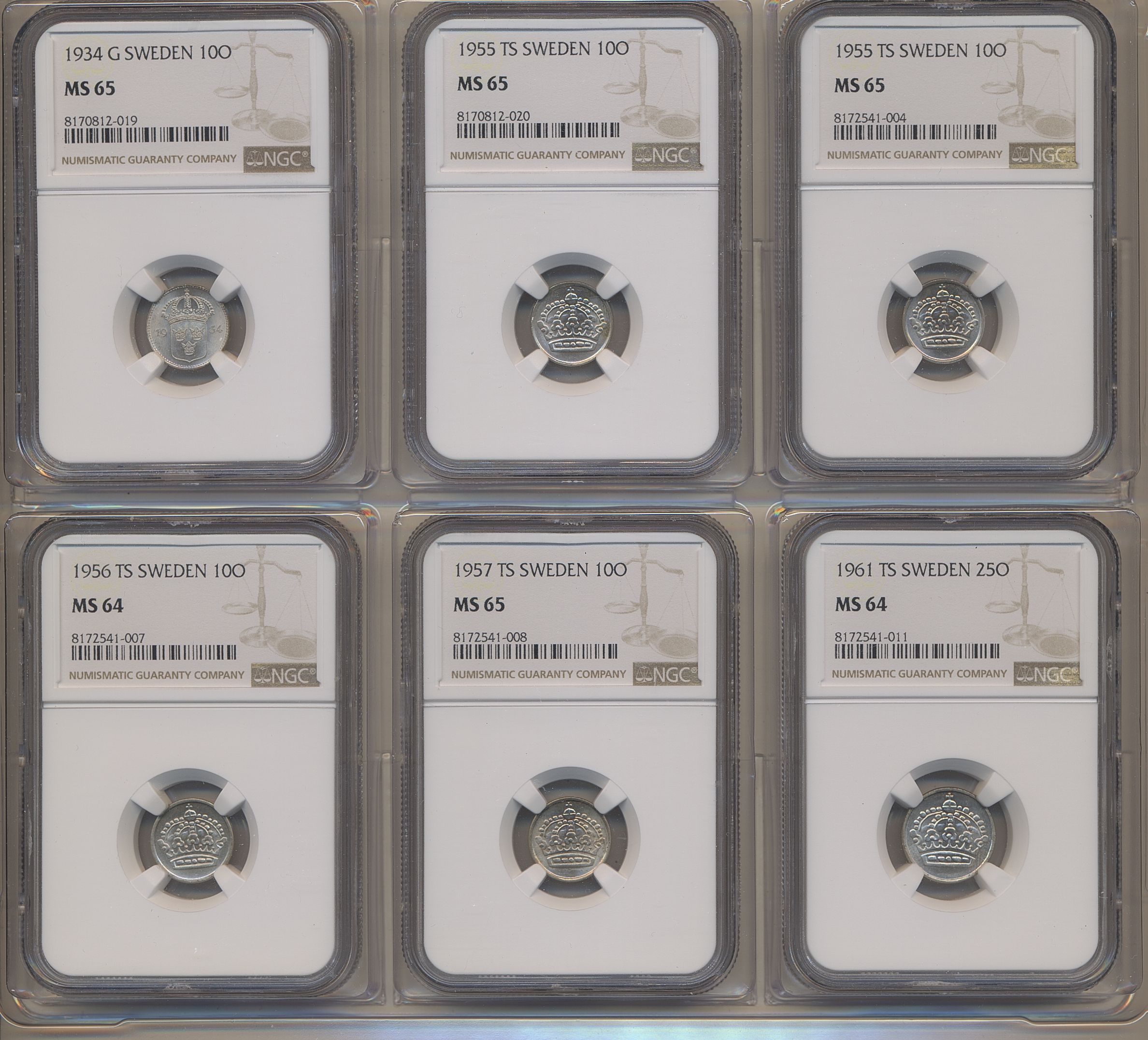 Coins, Sweden. Gustav V–Gustav VI Adolf, 10–25 öre 1934–1961, in total six coins in higher grades MS64–65 in NGC holders. (6).