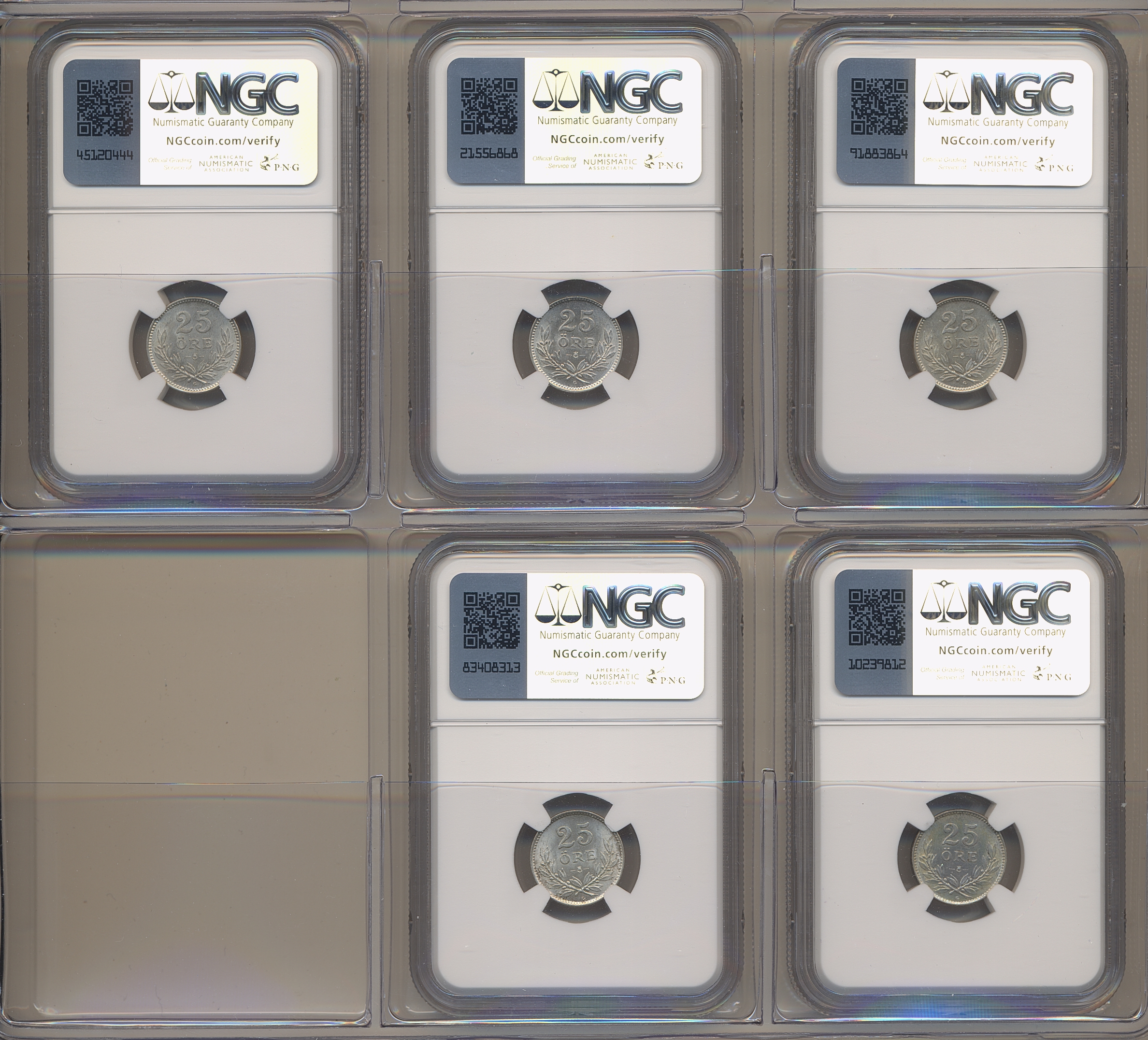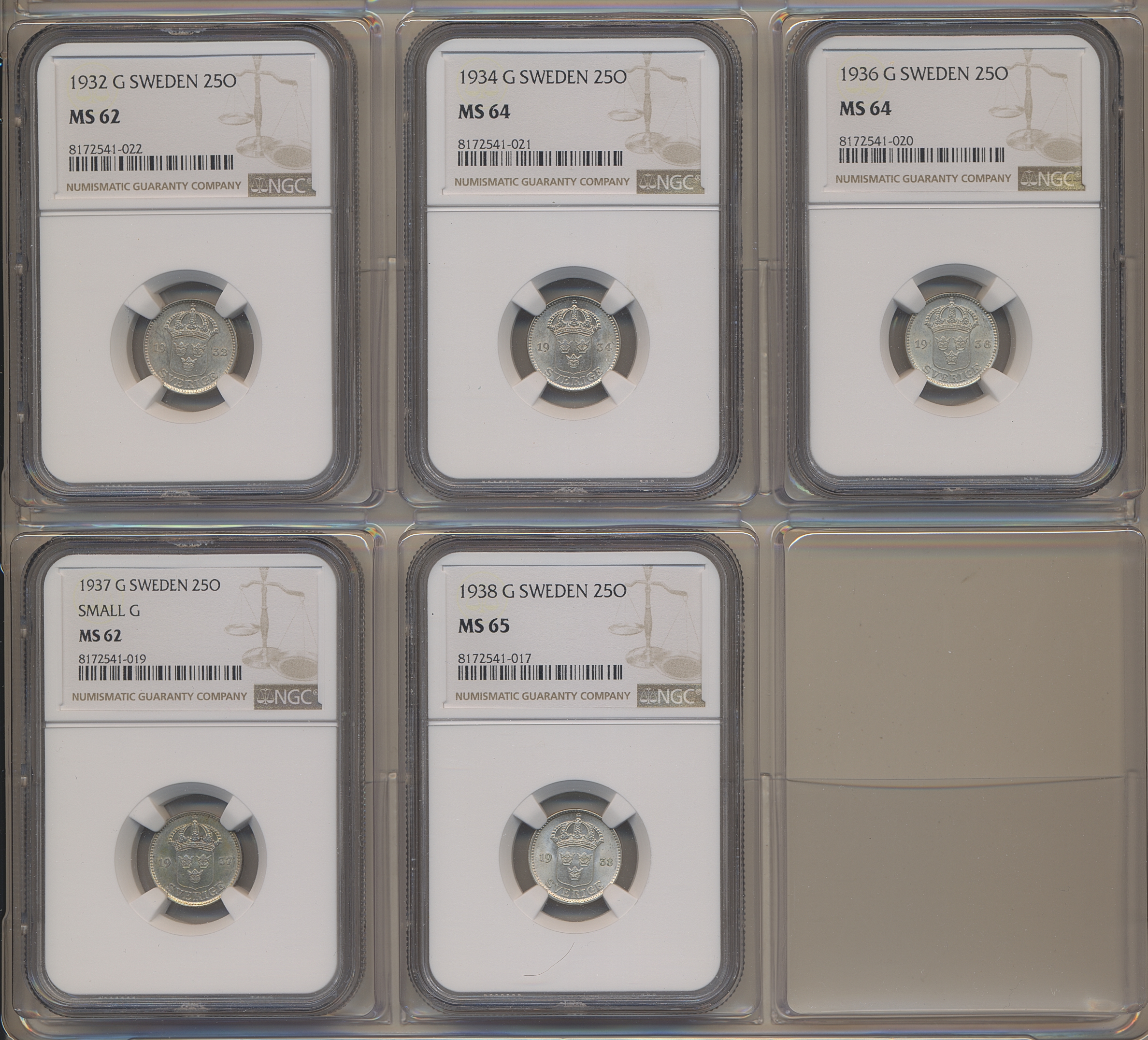 Coins, Sweden. Gustav V, 25 öre 1932–1938, in total five coins in higher grades MS62–65 in NGC holders. (5).
