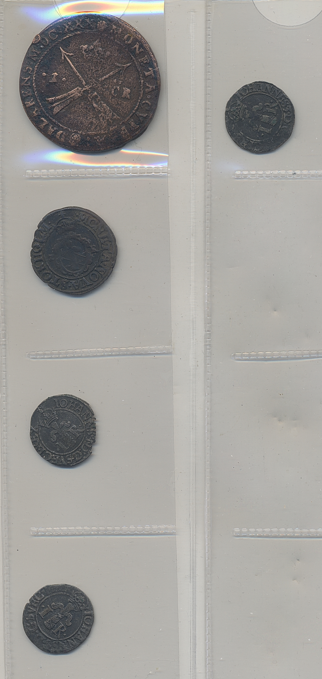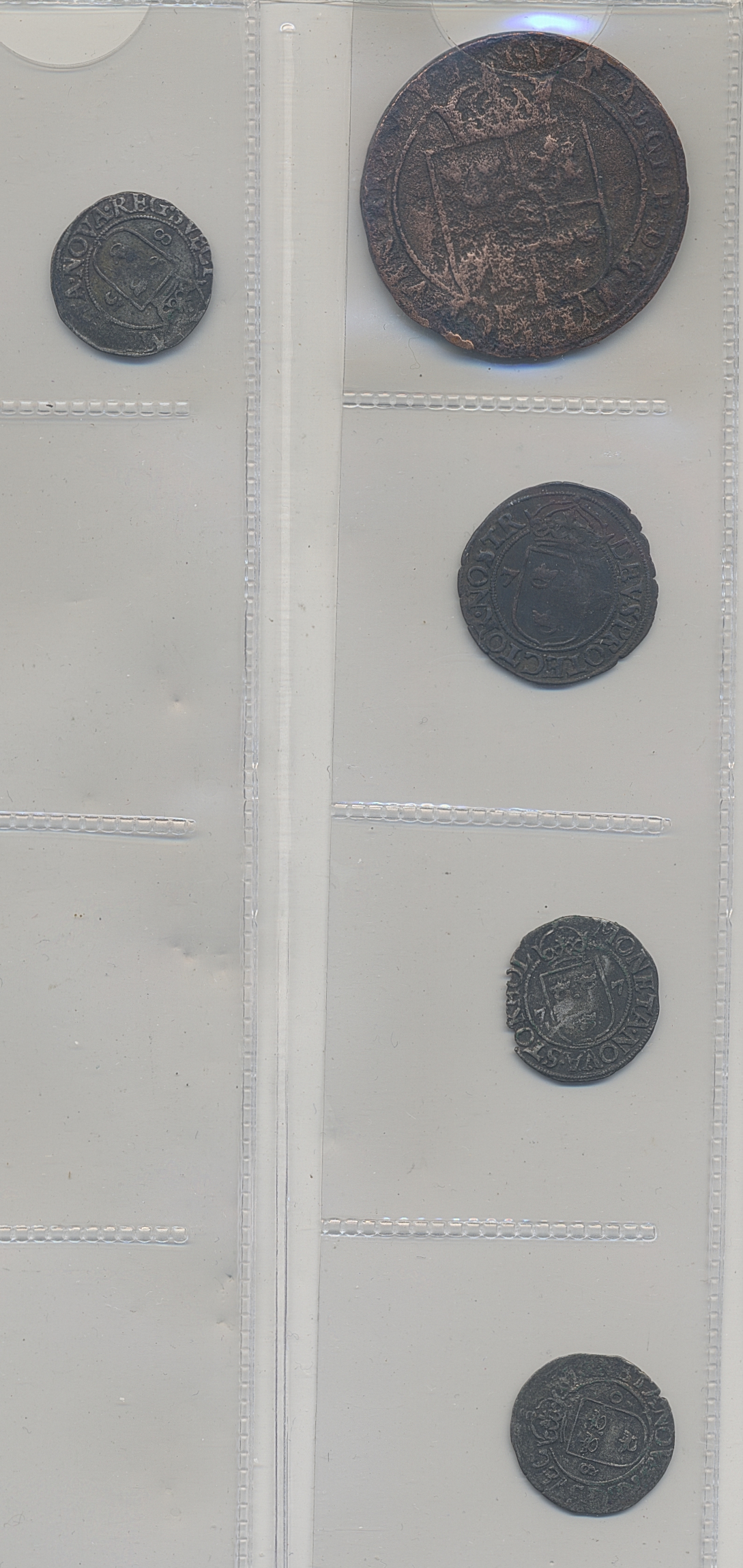 Coins, Sweden. Small group of Johan III ½ öre 1577, 1580, 1583 and 2 öre 1573 as well as a corroded 1 öre 1630 Gustav II Adolf. 1?-1+.