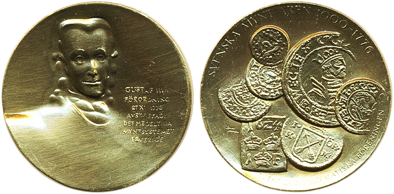 Medals, non-regal, Sweden. "SVENSKA MYNT ÅREN 1000–1776". Medal in gold, 31 mm, 25.68 g. 18K, by Ernst Nordin. Issued by Svenska Numismatiska Föreningen. Number 2 · 1000 on edge. 0.