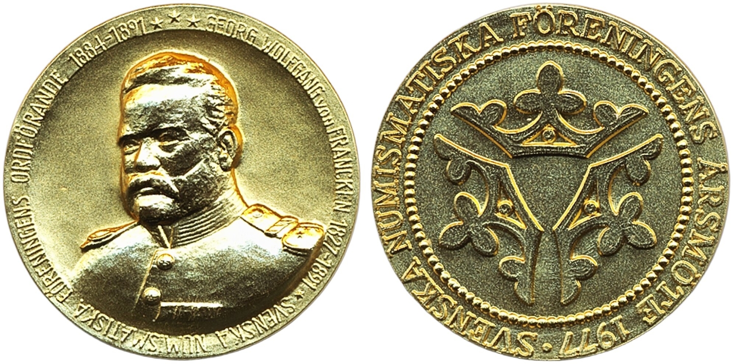 Medals, non-regal, Sweden. SVENSKA NUMISMATISKA FÖRENINGENS ÅRSMÖTE 1977. Georg Wolfgang von Franken (1827–1891). Medal in gold, 31 mm, 24.76 g. 18K. Number 7 on edge. Only ten examples struck. 0.