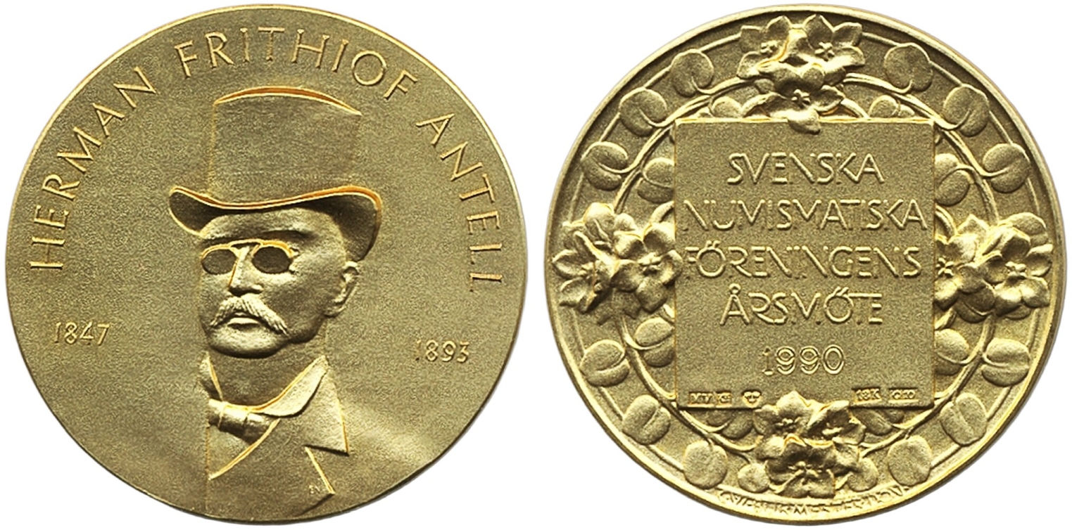 Medals, non-regal, Sweden. SVENSKA NUMISMATISKA FÖRENINGENS ÅRSMÖTE 1990. Herman Frithiof Antell (1847–1893). Medal in gold, 31 mm, 20.60 g. 18K. Only four examples struck. 0.