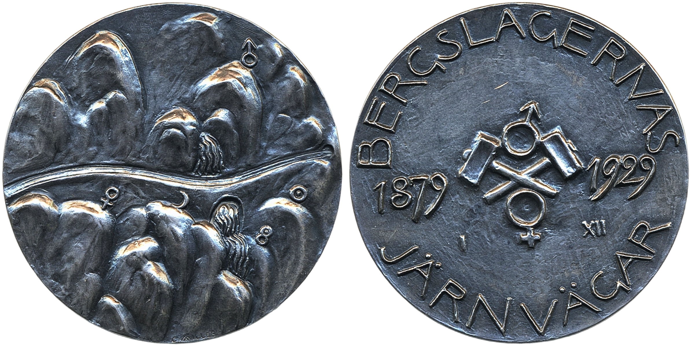 Medals, non-regal, Sweden. "BERGSLAGERNAS JÄRNVÄGAR 1879–1929". Medal in silver, 50 mm, 60.69 g., by Carl Milles. 01.