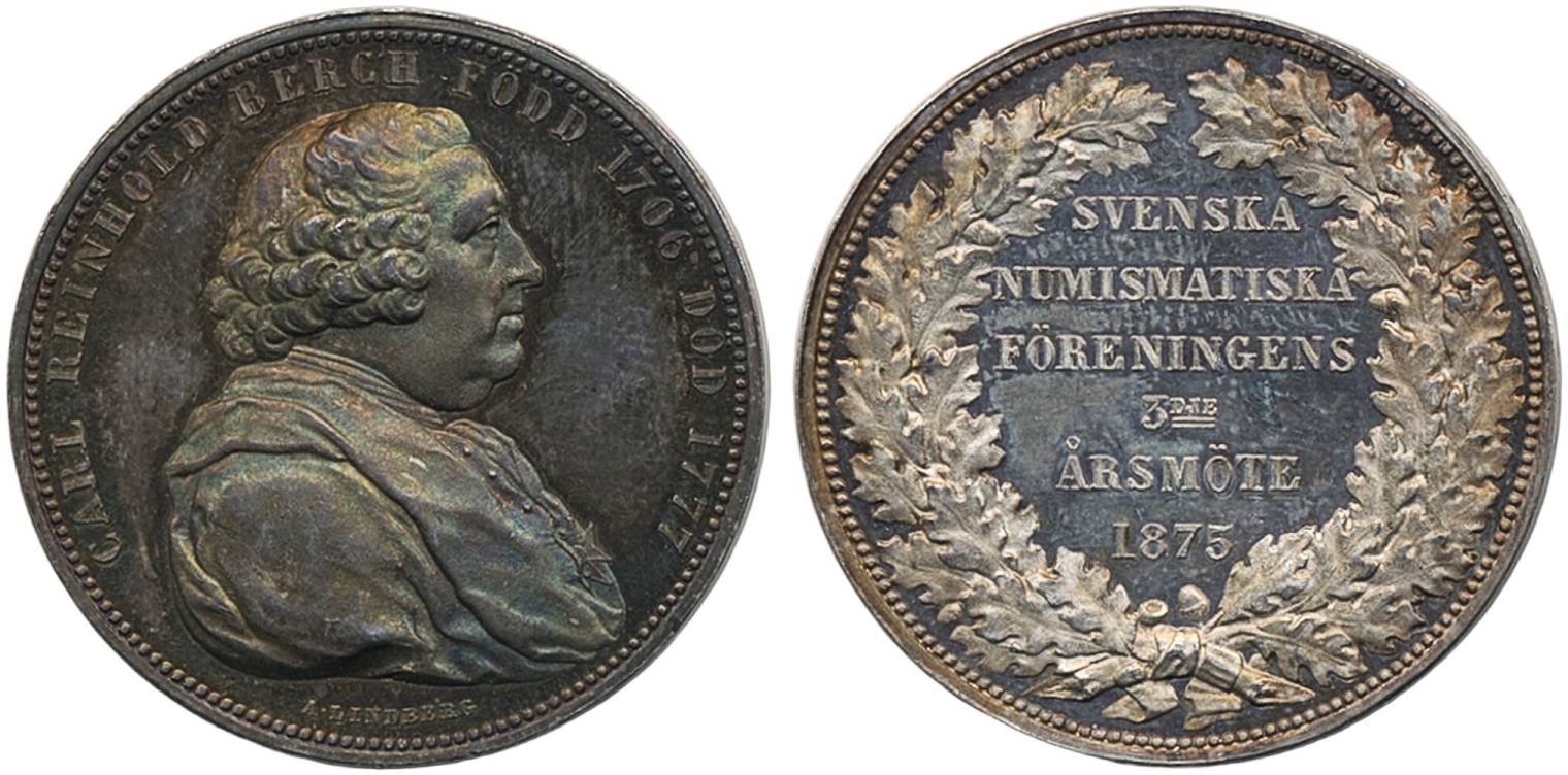 Medals, non-regal, Sweden. SNF 4, Carl Reinhold Berch (1706–1777). Medal in silver, 31 mm, 12.93 g. Svenska Numismatiska Föreningens tredje årsmöte 1875. Appealing rainbow-like patina. Choice! 01/0.