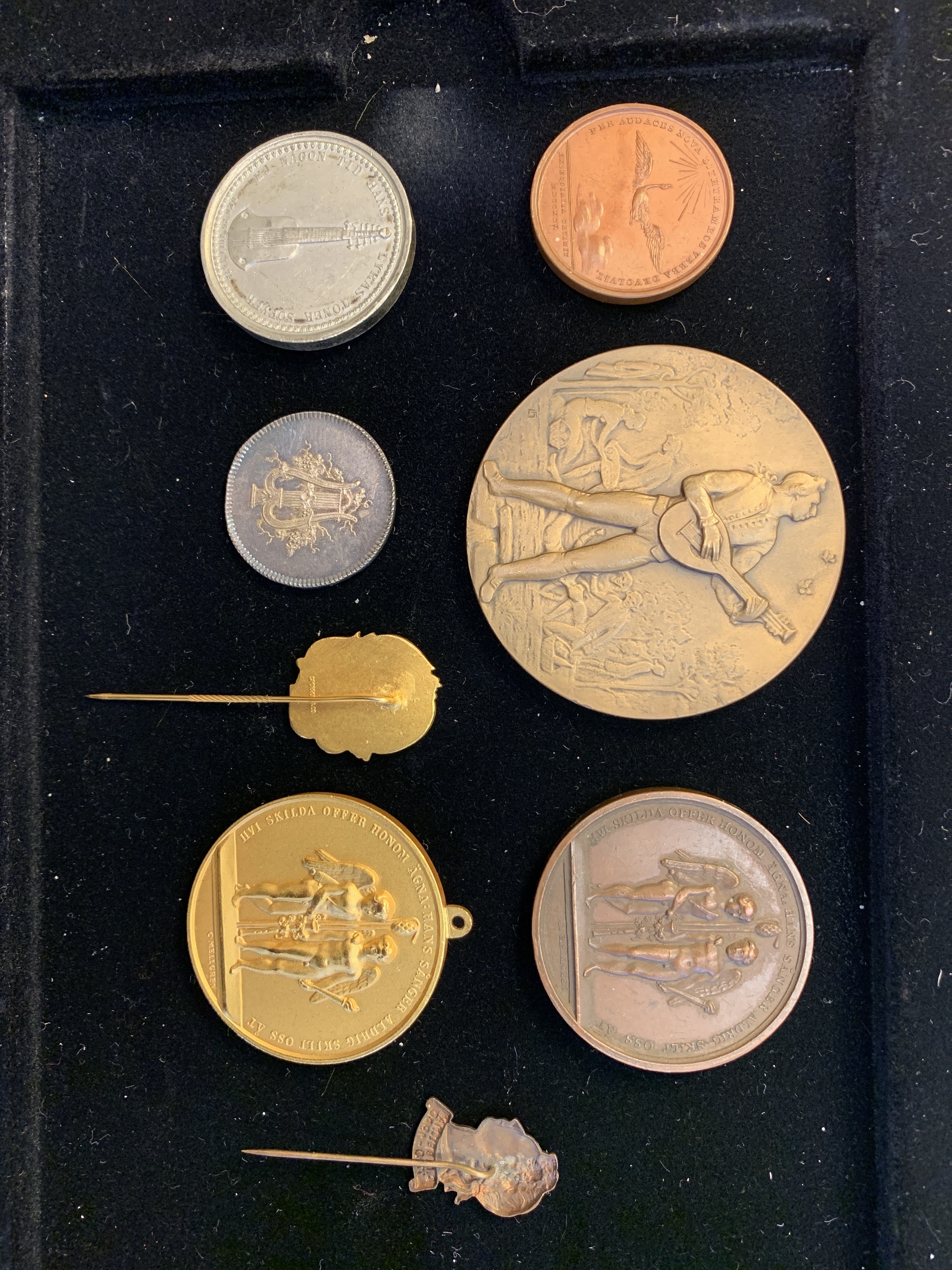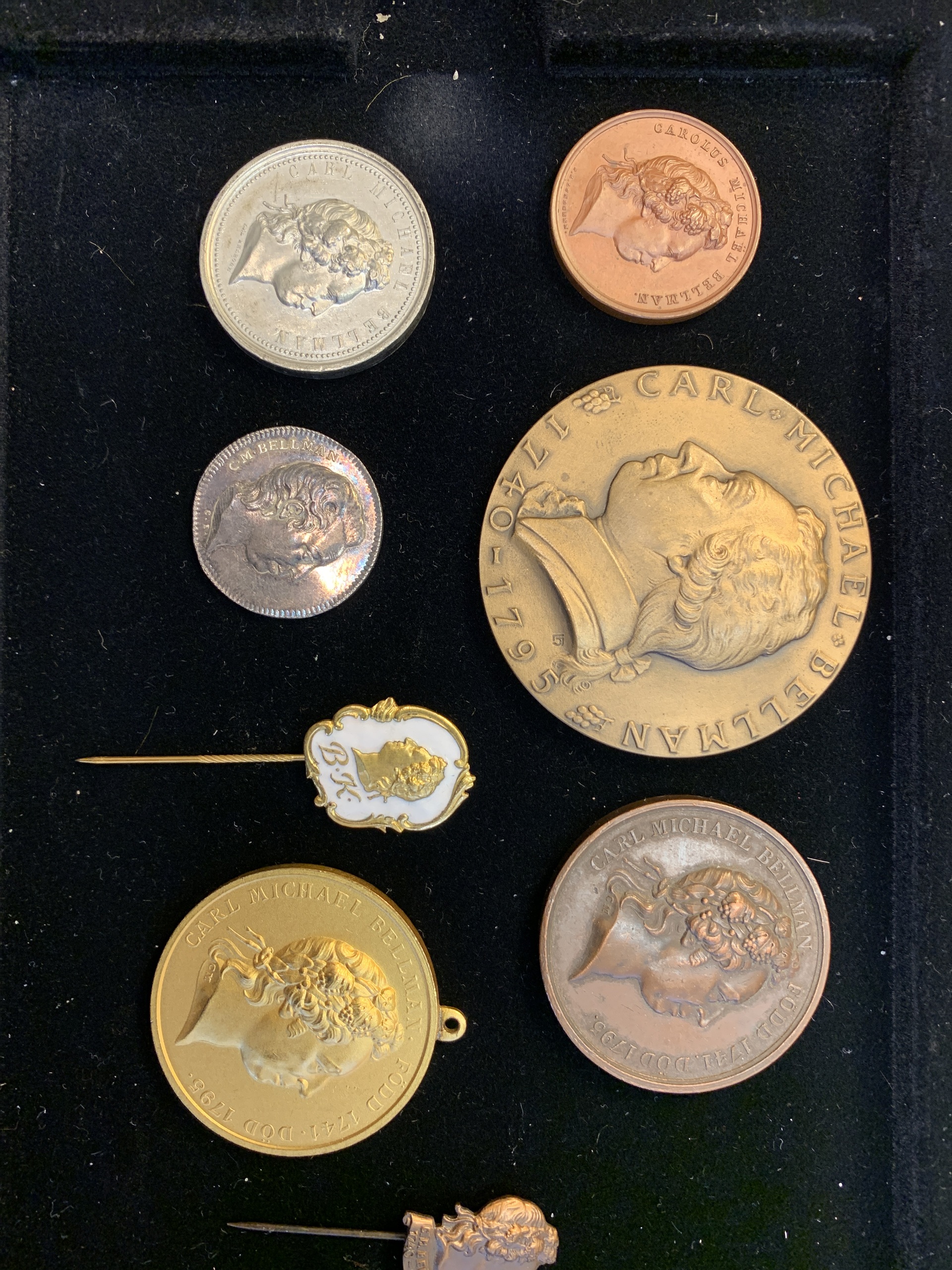 Medals, non-regal, Sweden. Lot. Carl Michael Bellman (1740–1795). Six medals and two pins. The entire lot is presented at www.philea.se. 01.