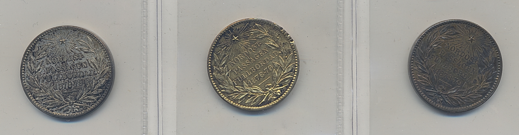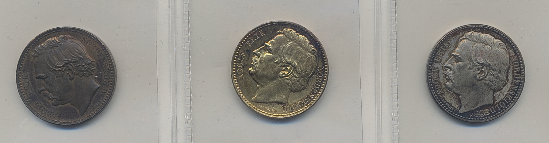 Medals, non-regal, Sweden. Hyckert II:1, 1a, Lot. Adolf Erik Nordenskiöld (1832–1901). Professor. Three medals, two in basic metals of which one is gilded, and one in silver with engraver's signature in front of the head. The entire lot is presented at www.philea.se. 1+-01.
