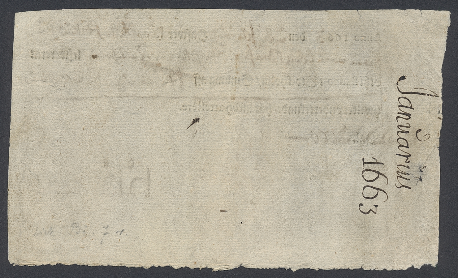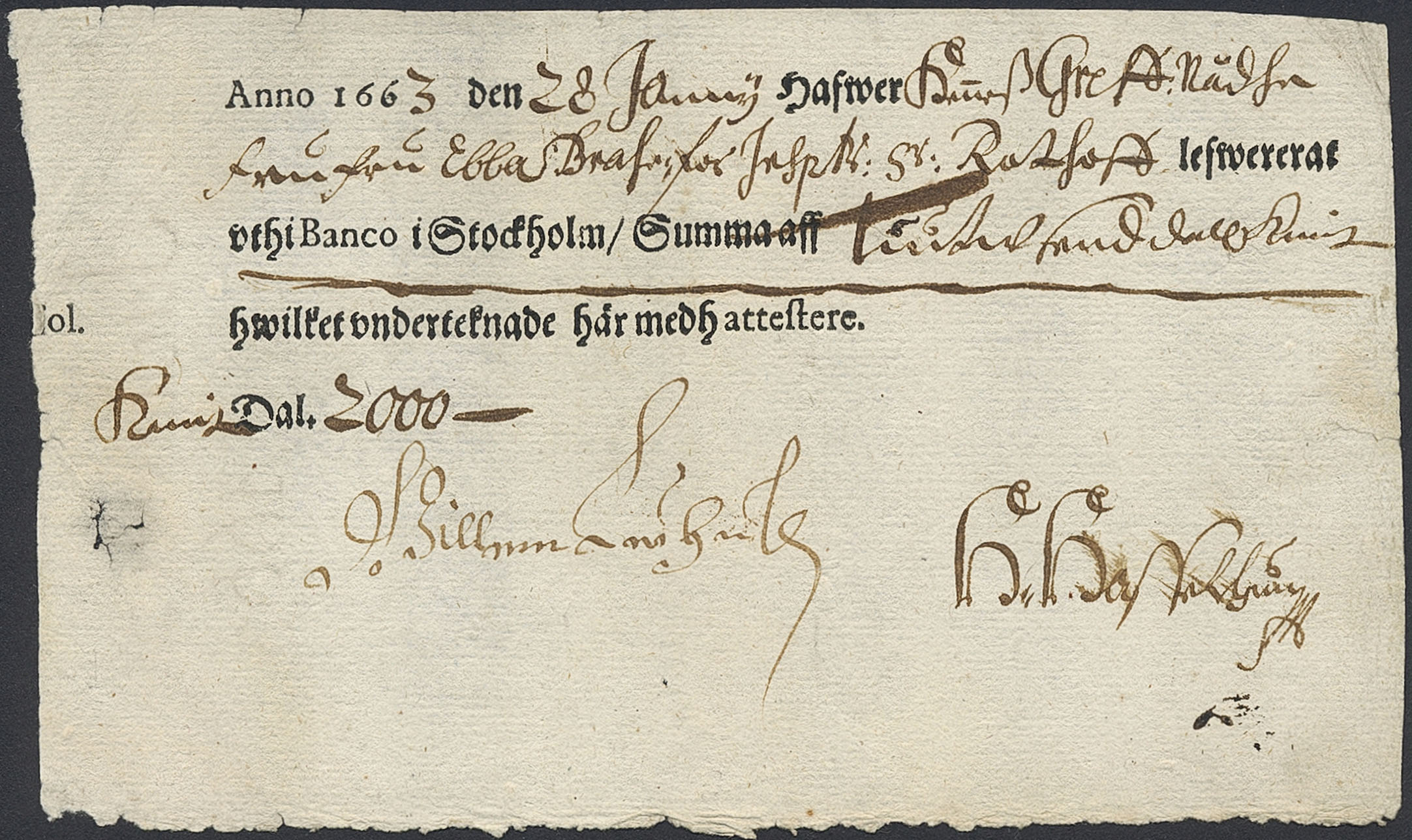 Banknotes, Sweden. Deposit receipt for 2000 daler, dated 28 January 1663 in Stockholms Banco. Ink writing on back "Januarius 1663". 01.
