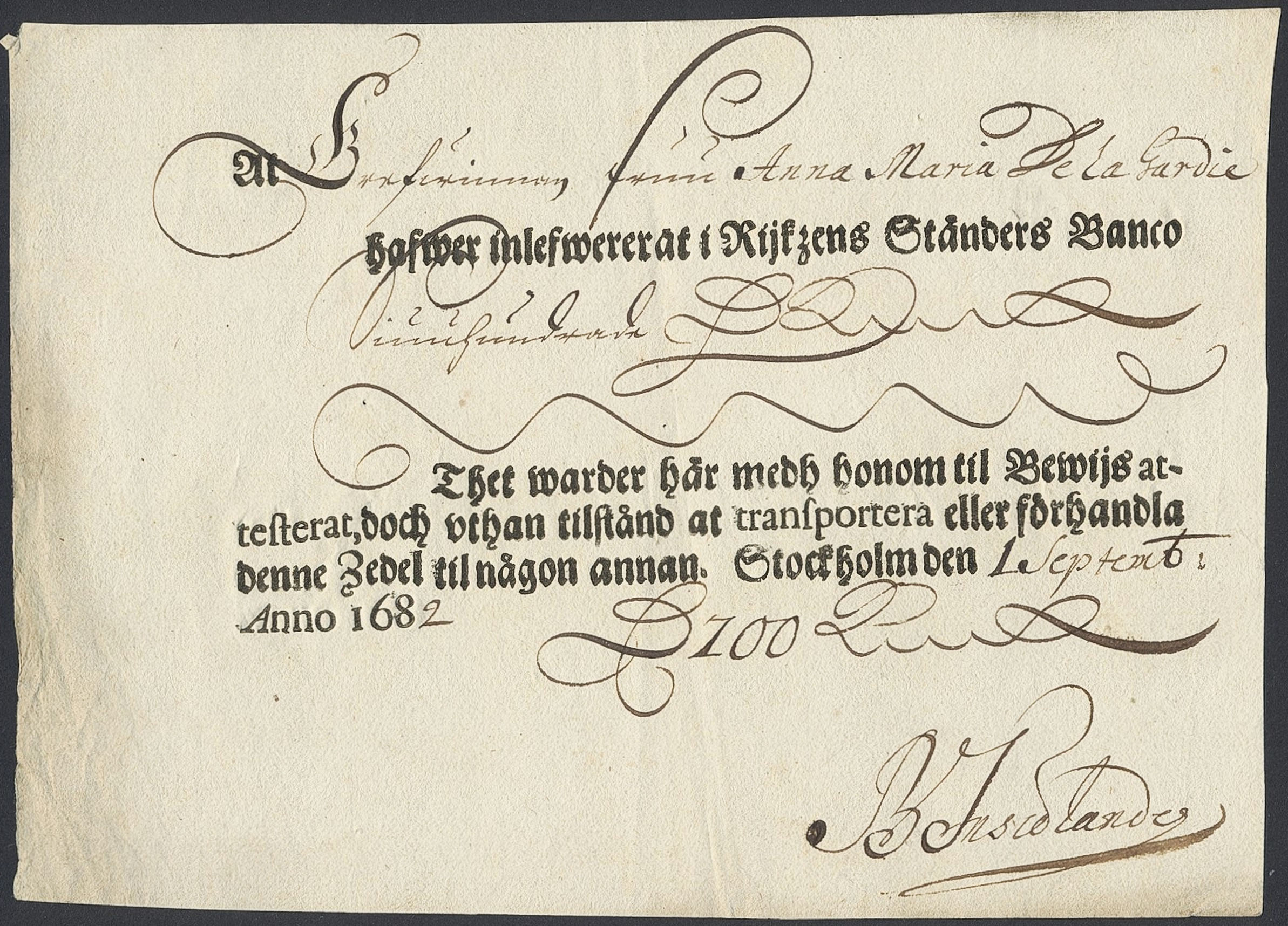 Banknotes, Sweden. Deposit receipt for 700 daler, dated 1 September 1682 in Riksens Ständers Banco, Stockholm. Ink writing on reverse. 1+.