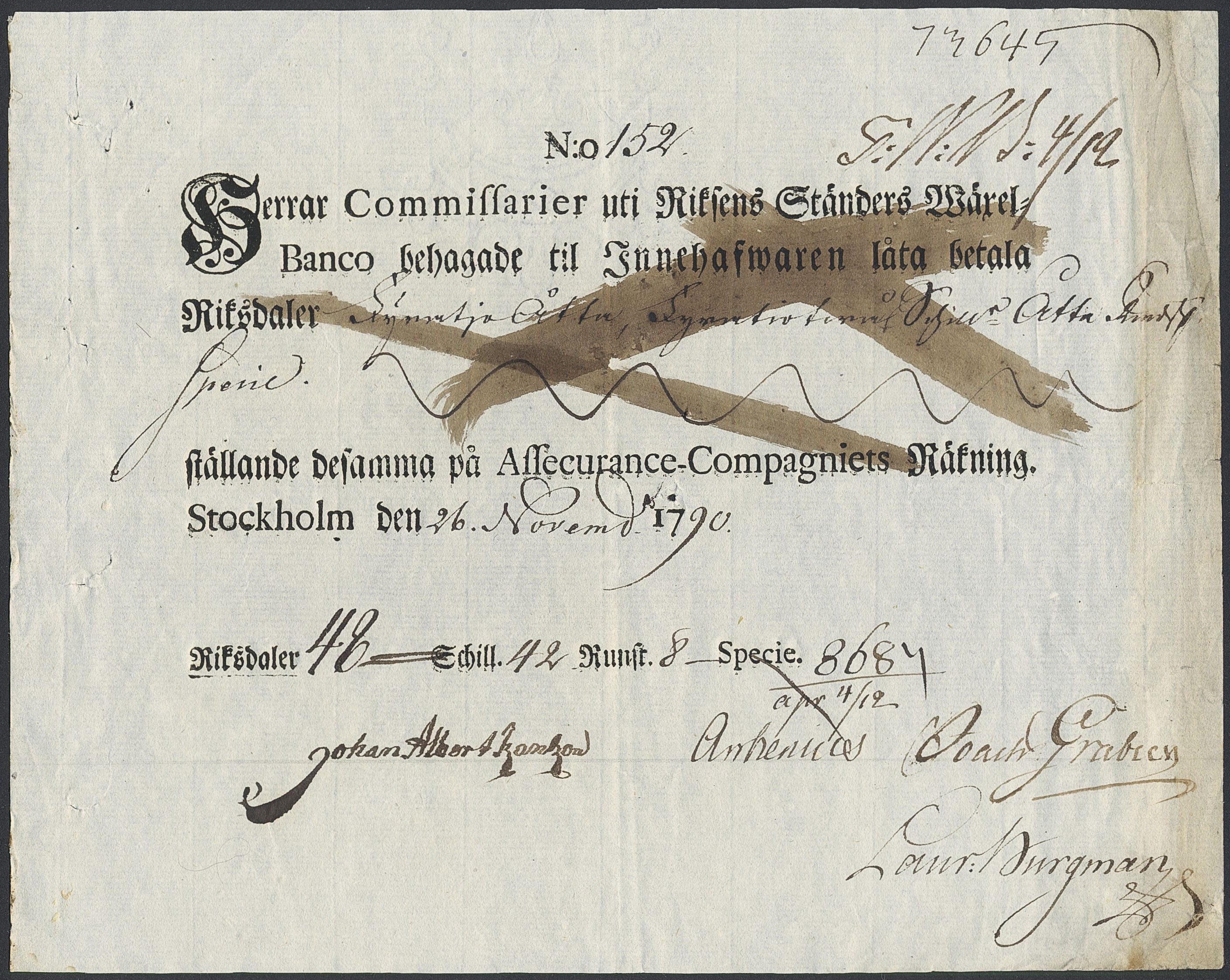 Banknotes, Sweden. Withdrawal receipt Assurance-Compagniet, dated 26 November 1790 of 48 riksdaler and 48 runstycken and 8 specie. No 152. Ink cancelled. Ex. Höiland auction May 2007 lot 4307. 1+.