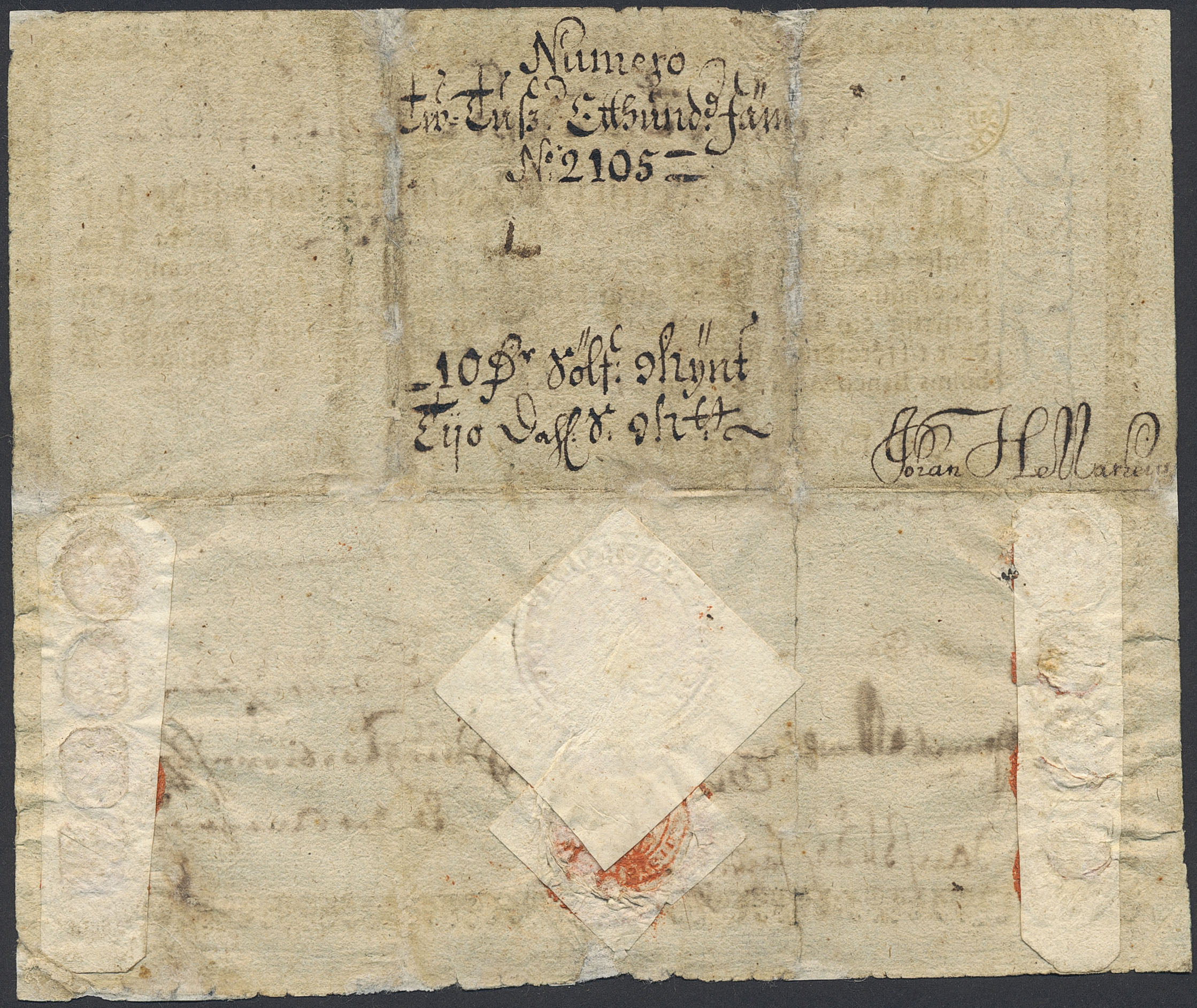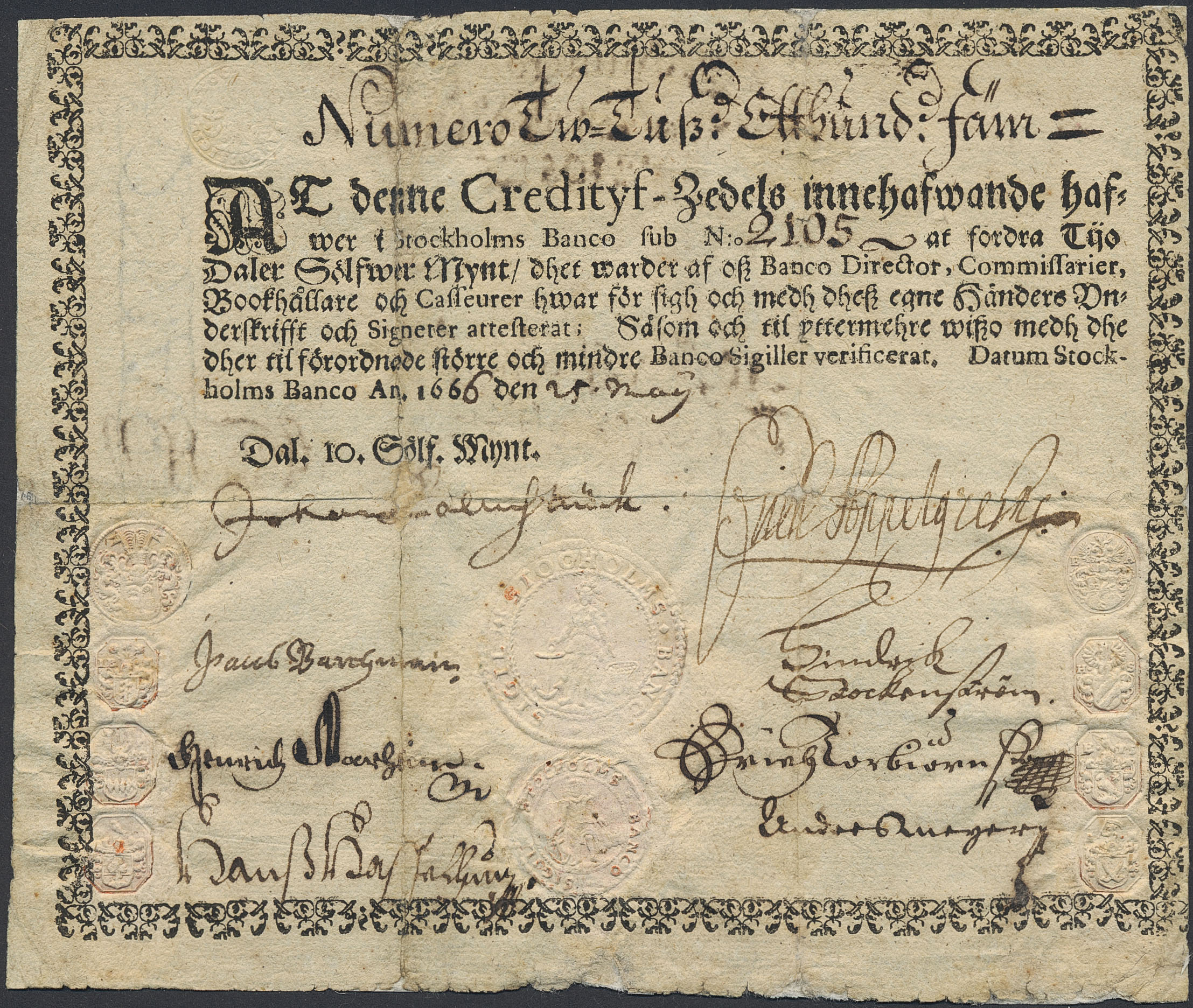 Banknotes, Sweden. Pick A57, 10 daler silvermynt 1666. No 2105. So called Palmstruch. The first banknote in the western hemisphere! Fresh example with good paper, slightly reinforced. DSS 4. 1/1+.