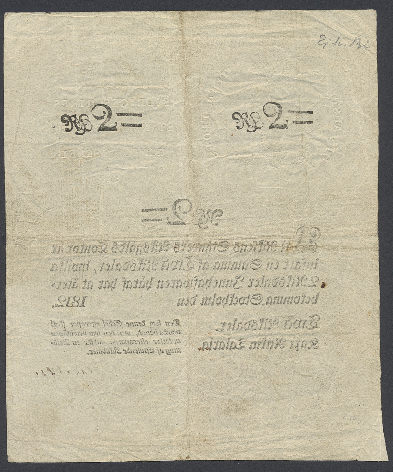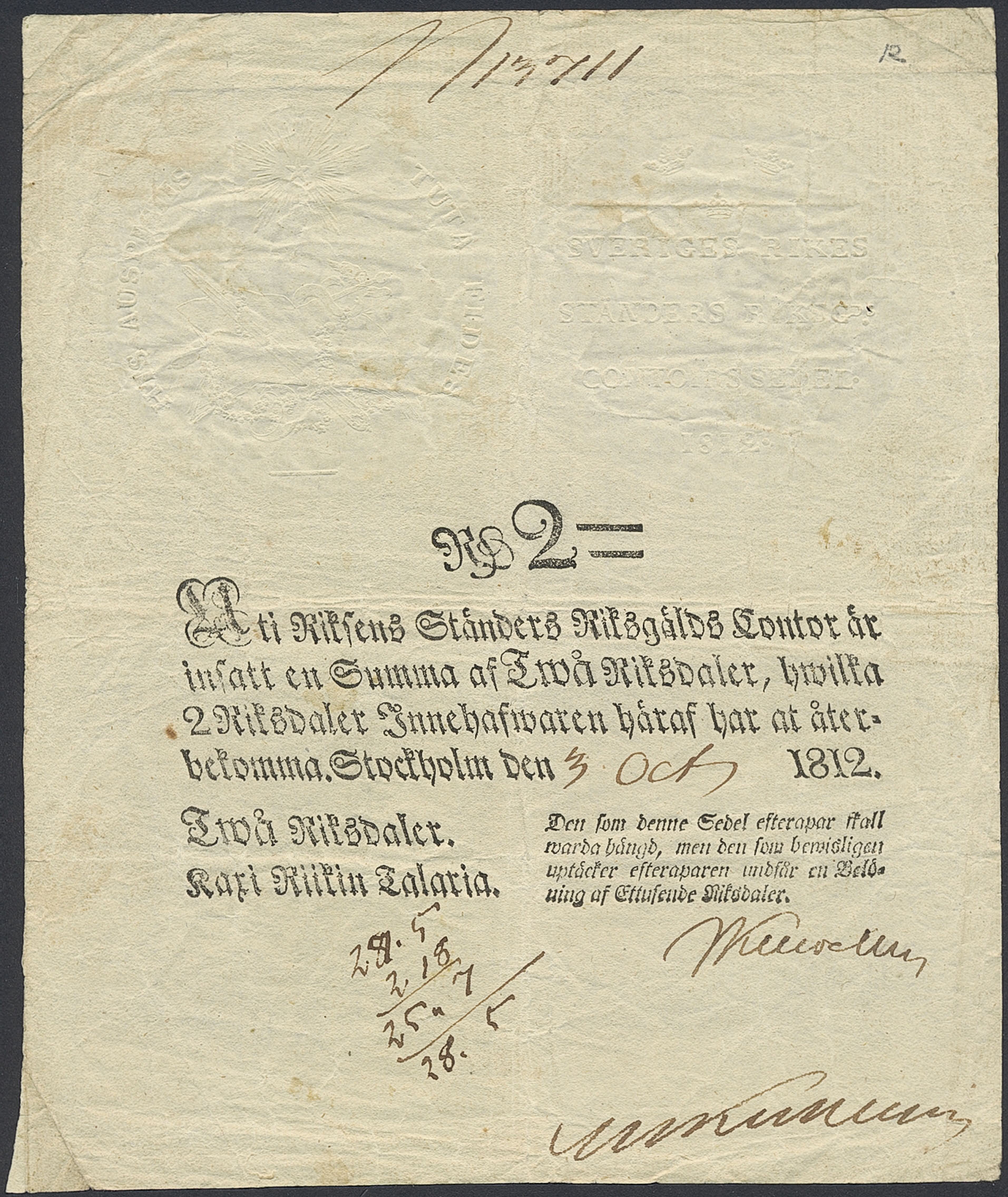 Banknotes, Sweden. Pick A118, 2 riksdaler 1812. No 13711. Minor ink writing. 1/1+.
