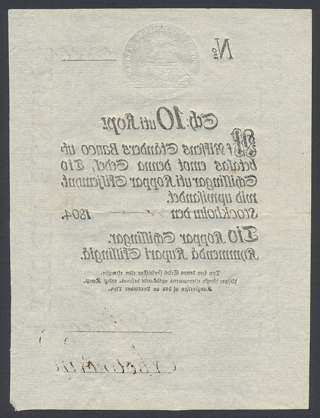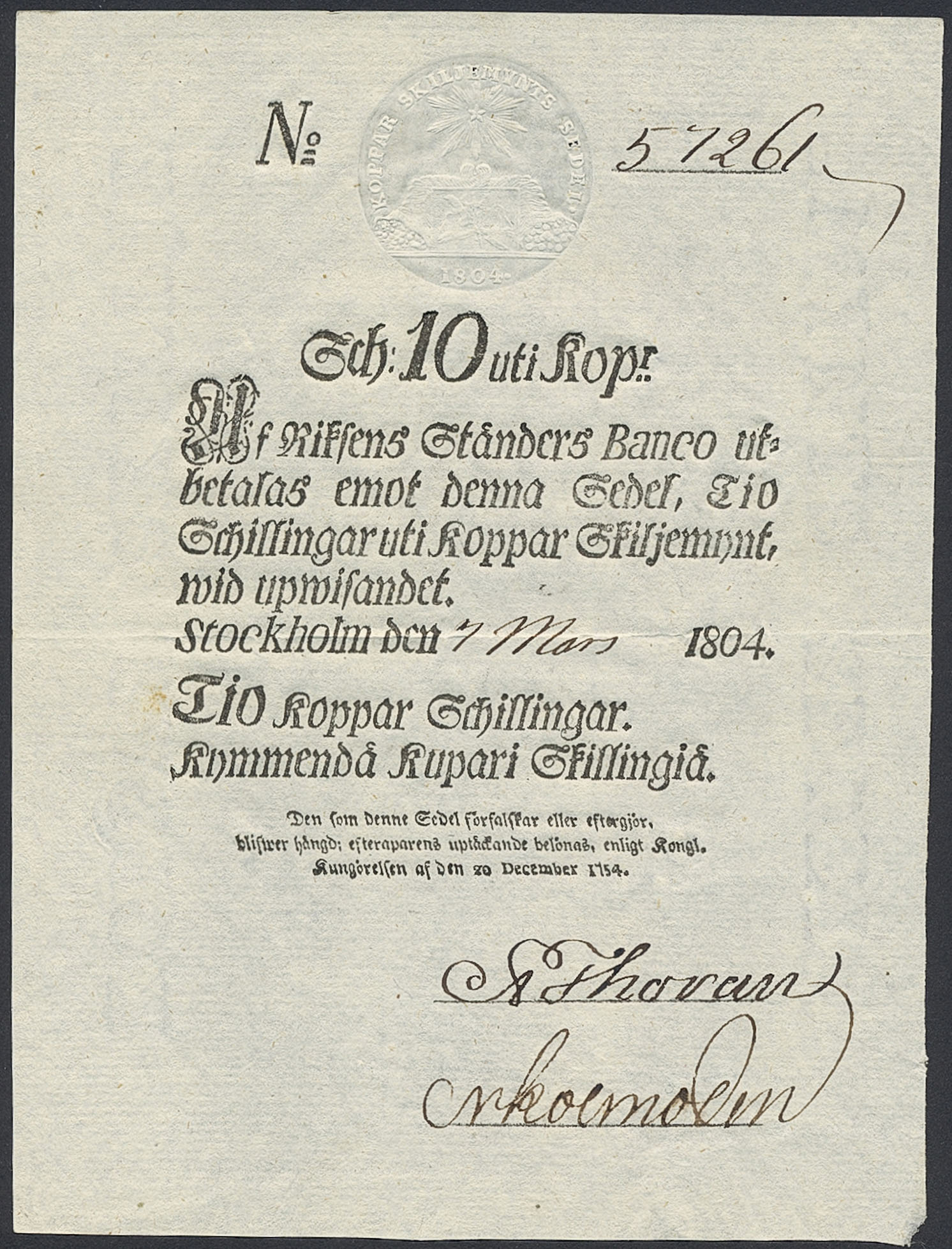 Banknotes, Sweden. DSS 191, 10 kopparskillingar 1804. No 57261. Fresh example with light centre fold, minor pinholes. 01.