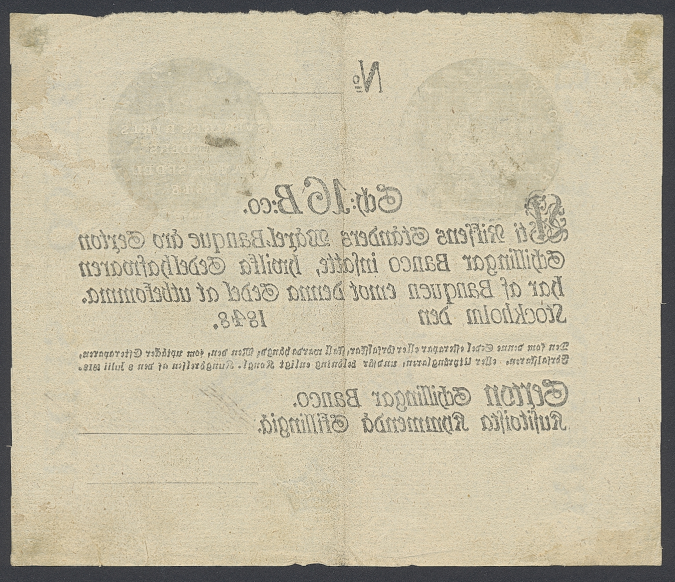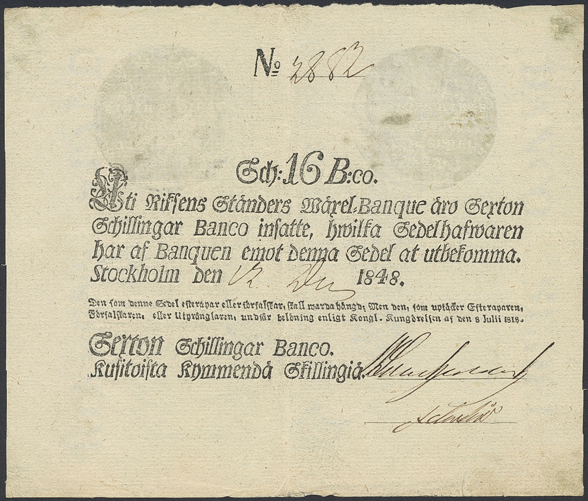 Banknotes, Sweden. DSS 360, 16 skillingar banco 1848. No 2882. Minor mount mark on reverse, else light centre fold. 1+/01.