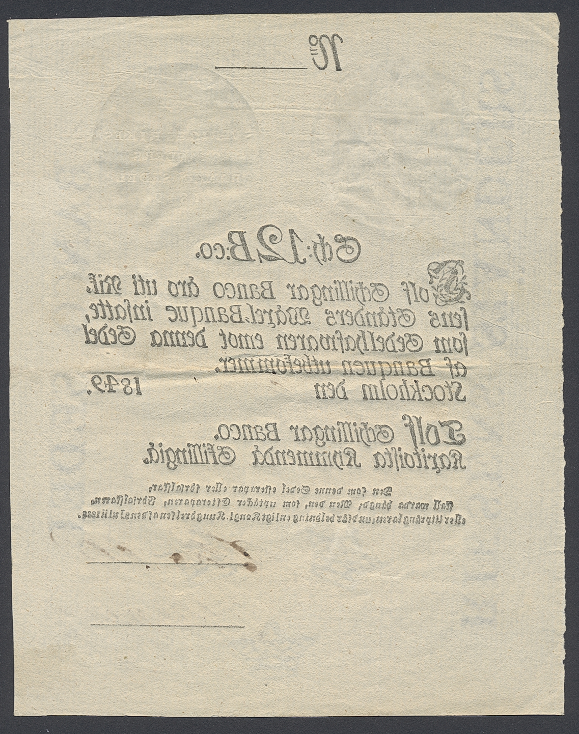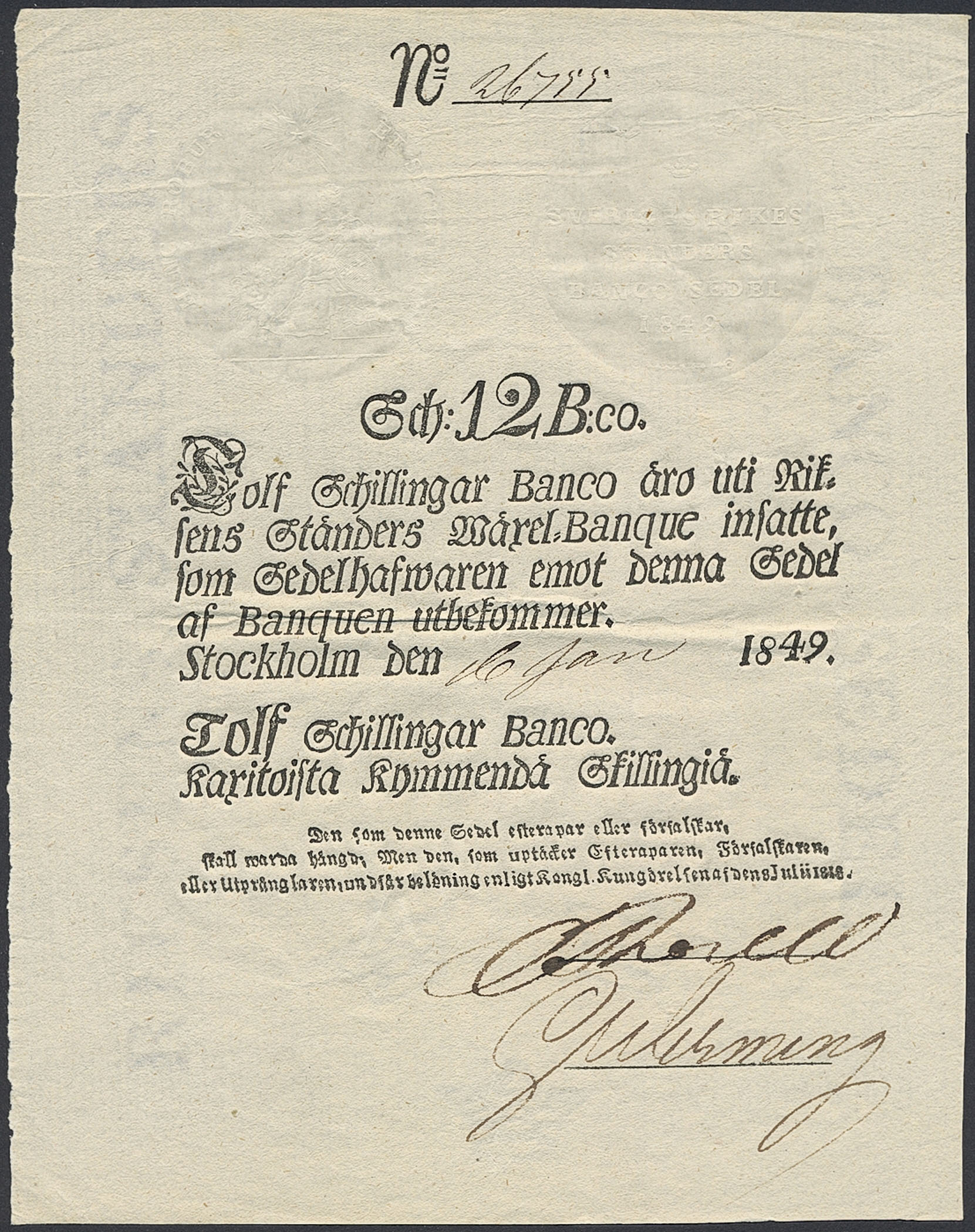 Banknotes, Sweden. DSS 378, 12 skillingar banco 1849. No 26799. Light centre fold. 01.