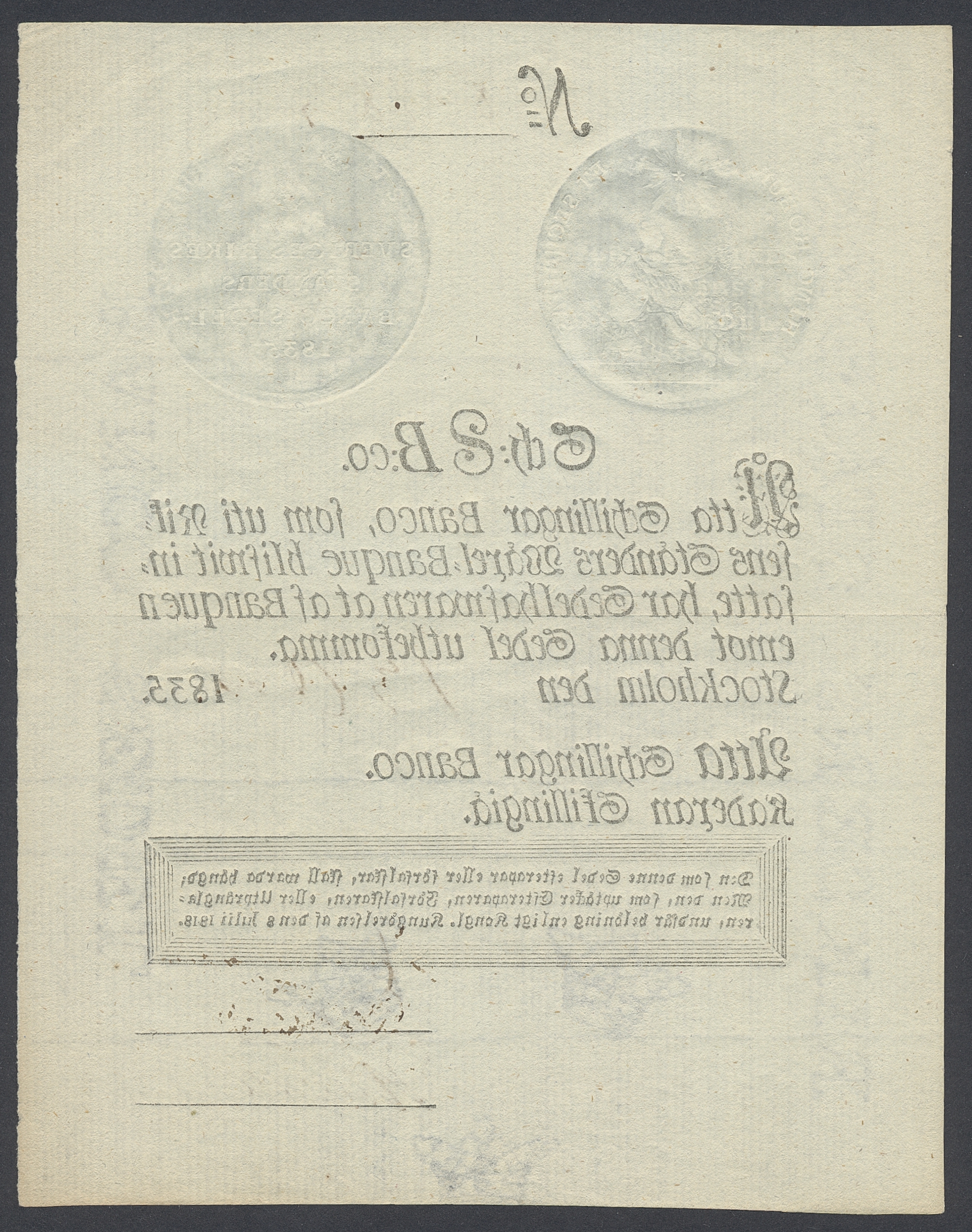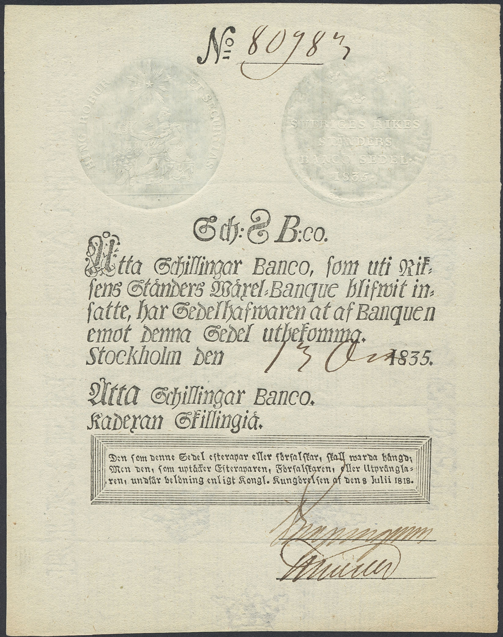 Banknotes, Sweden. DSS 380, 8 skillingar banco 1835. No: 80983. 1+.