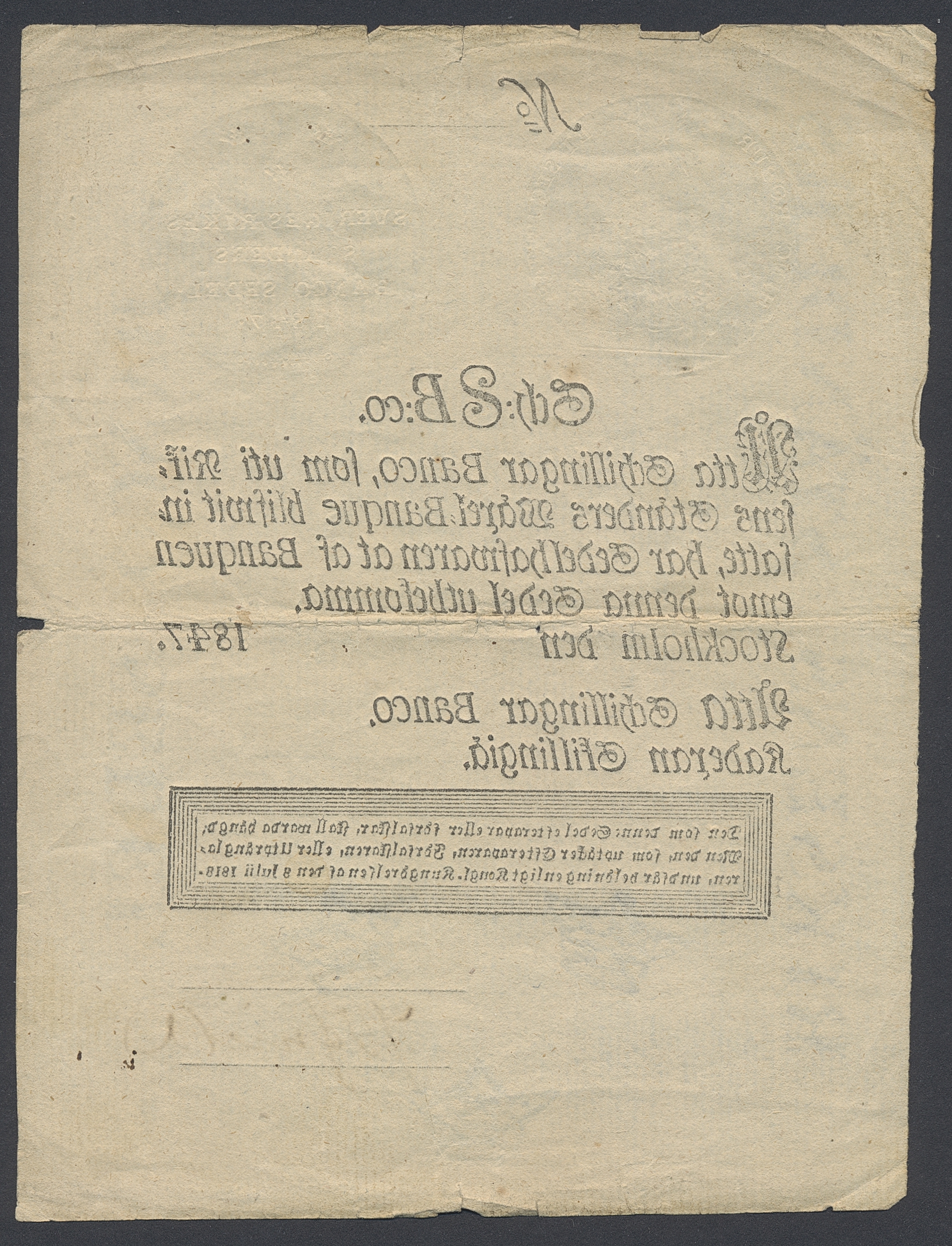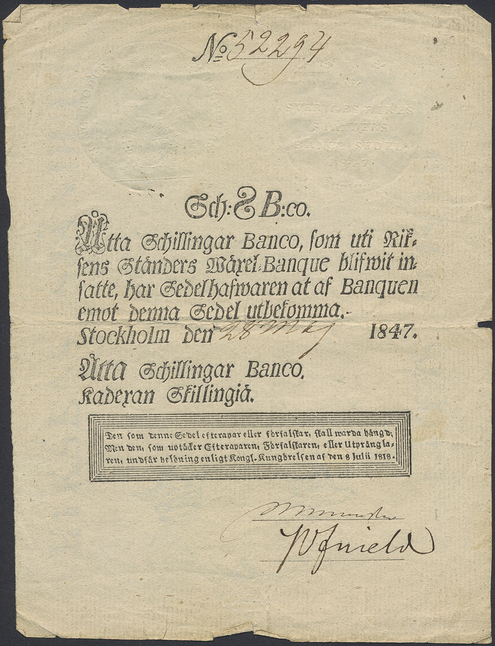 Banknotes, Sweden. DSS 393, 8 skillingar banco 1847. No: 52294. Plat 30B. 1.