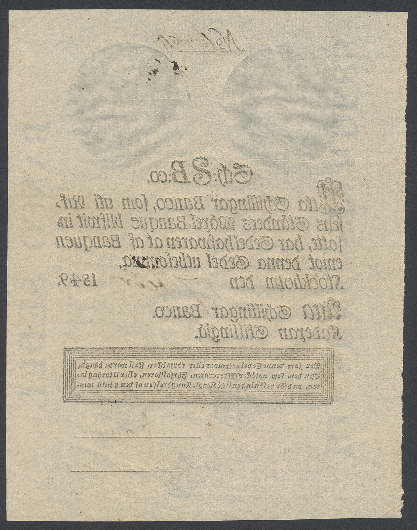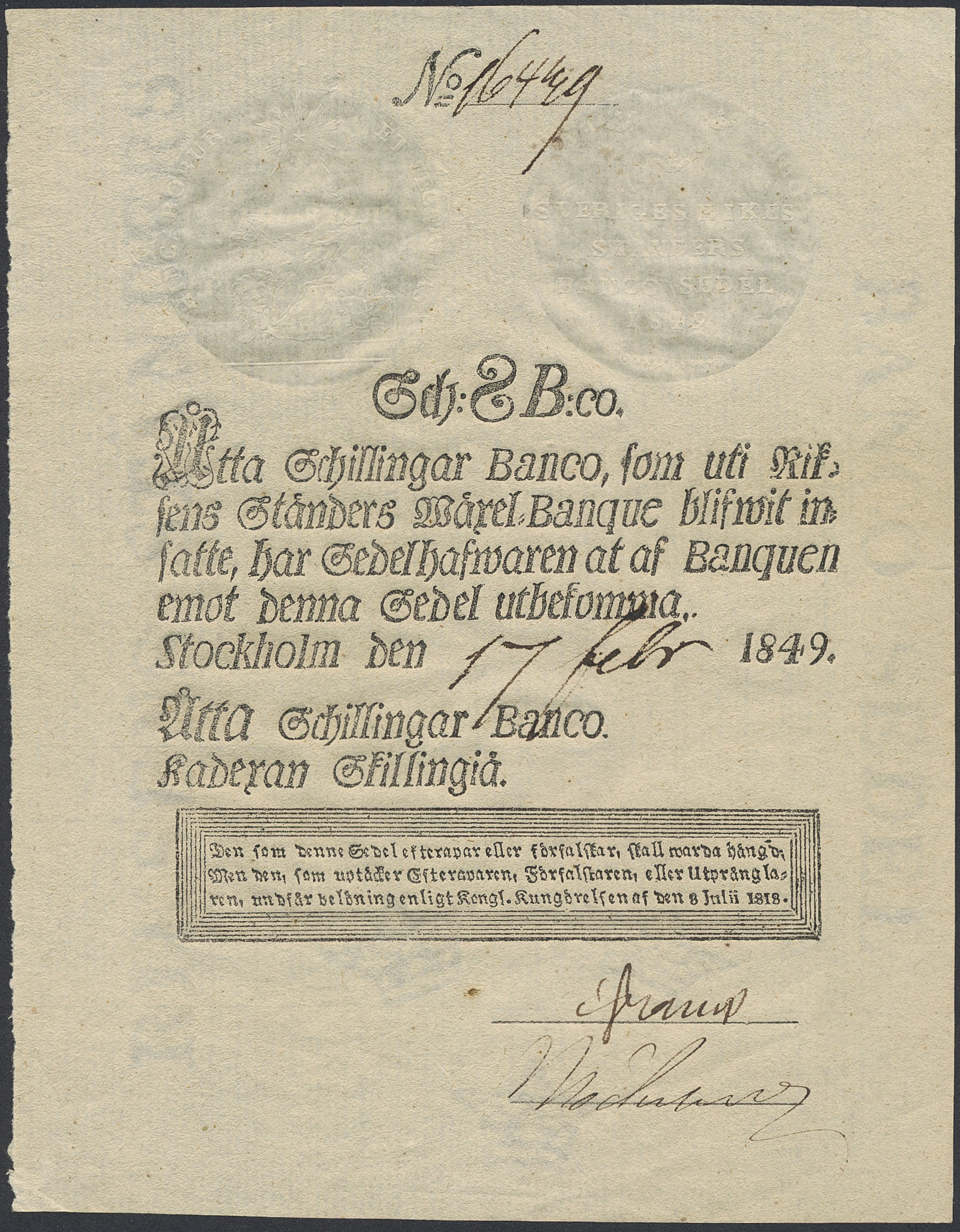 Banknotes, Sweden. DSS 395, 8 skillingar banco 1849. No: 16449. 01.