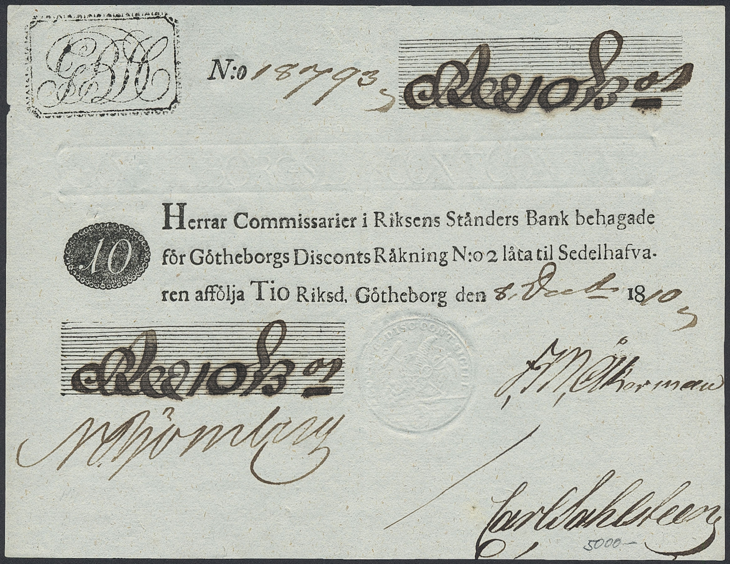 Banknotes, Sweden. Plat 55, 10 riksdaler banco 1810. Göteborgs Diskontverk. No 18793. 01.