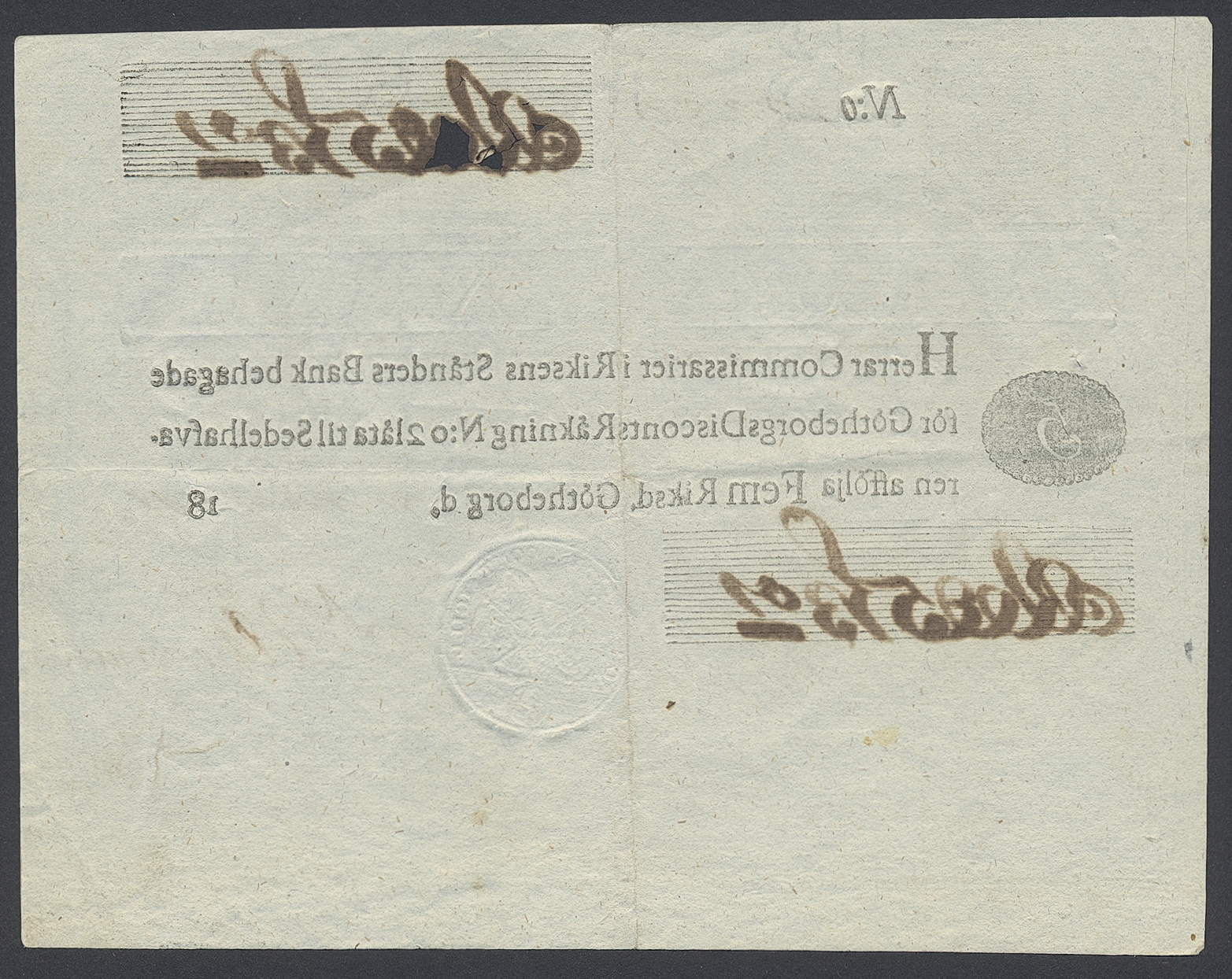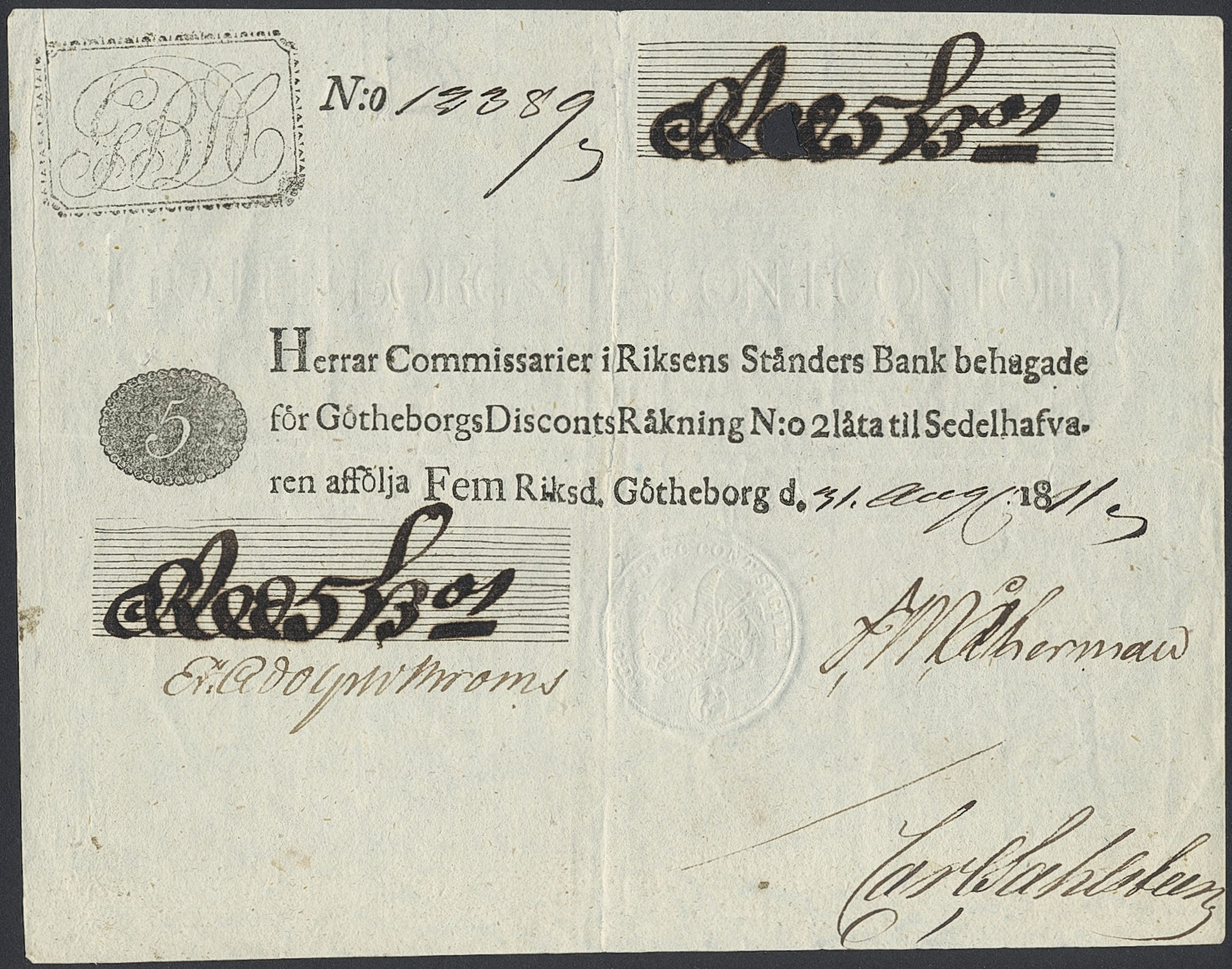 Banknotes, Sweden. Plat 54, 5 riksdaler banco 1811. Göteborgs Diskontverk. No 12389. Hole in the area of ink in top right denomination. 1+.