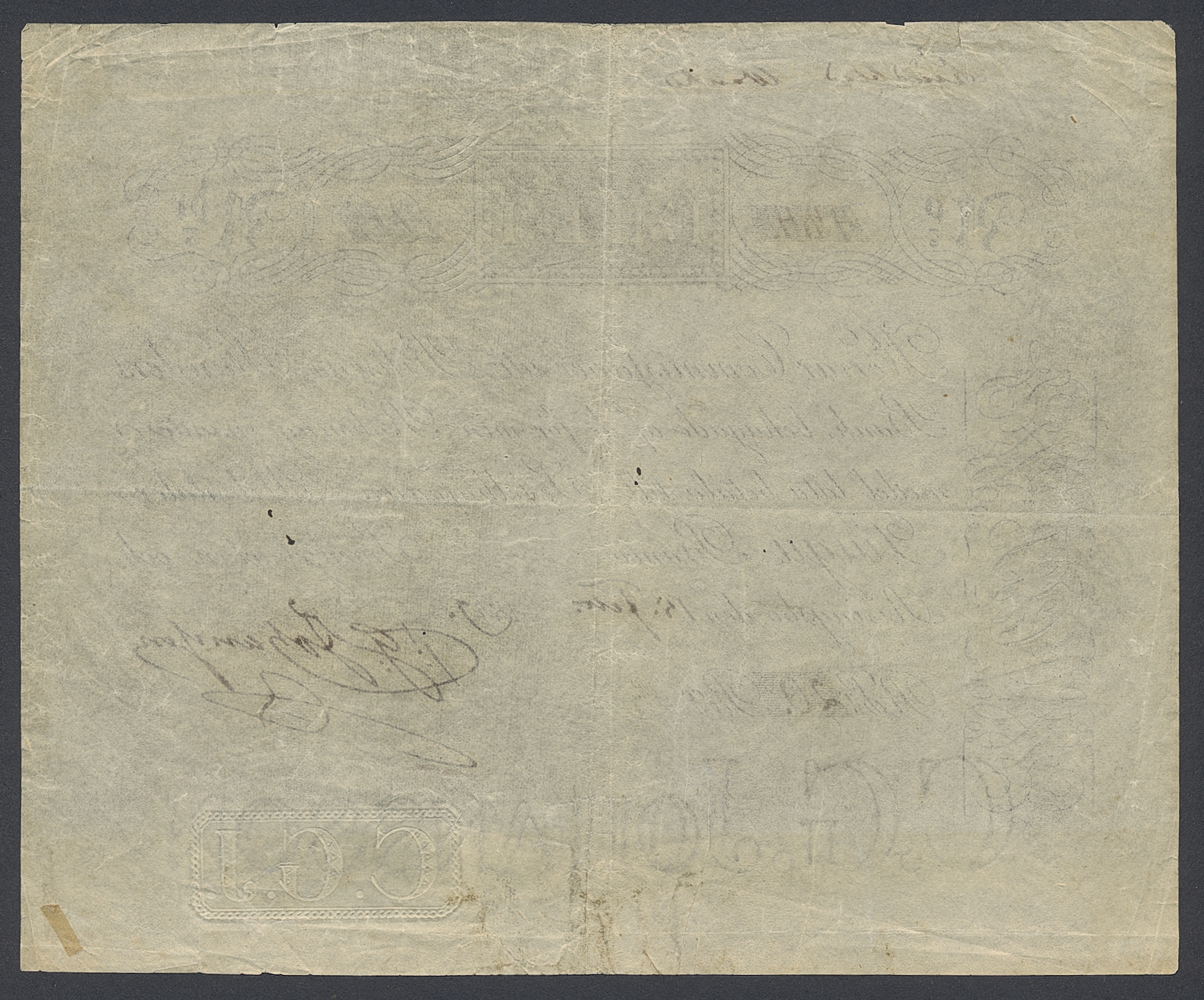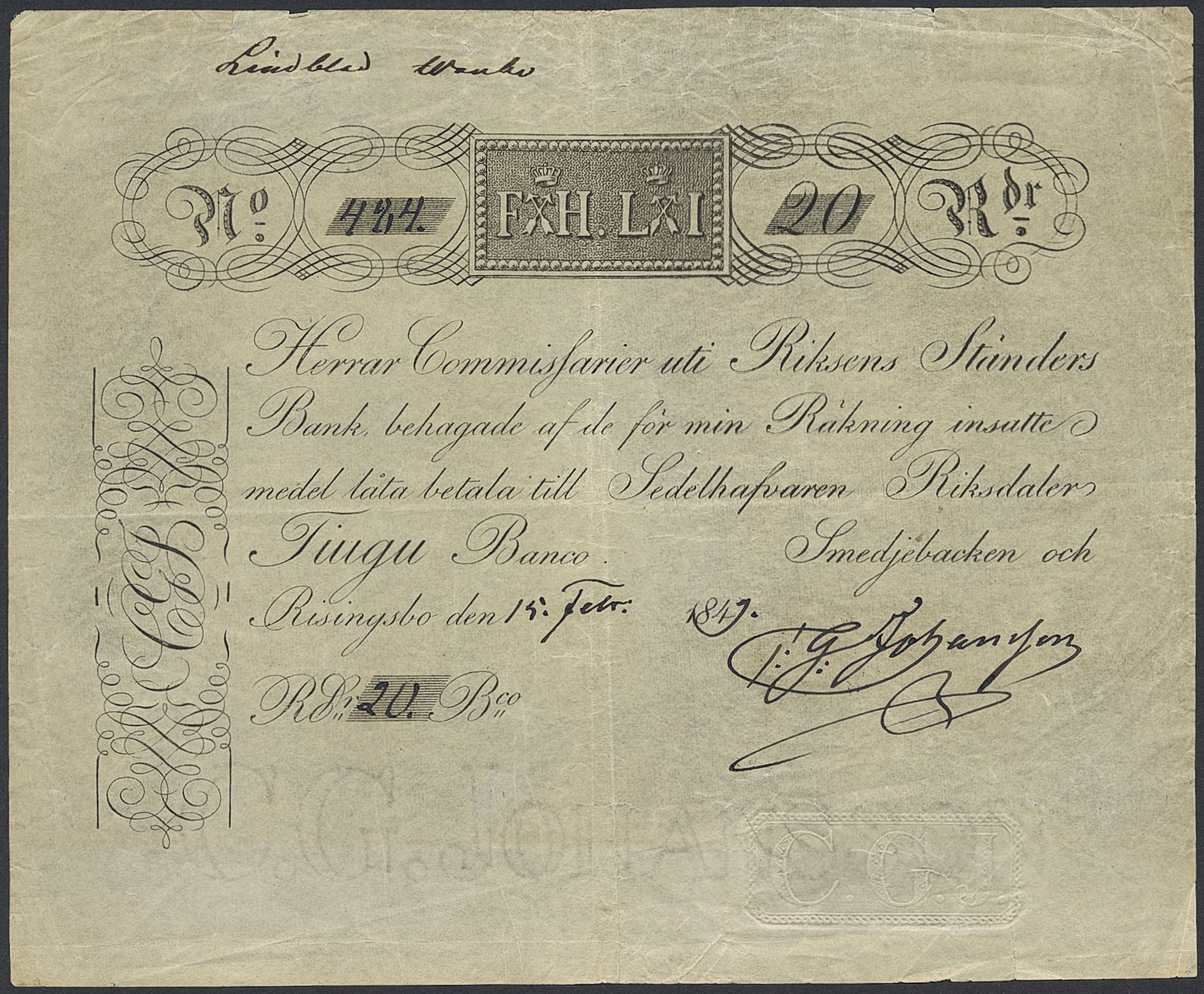 Banknotes, Sweden. Platz 76, 20 riksdaler banco 1849. No. 484. Smedjebacken. A few tears, ink writing in upper margin. 1/1+.