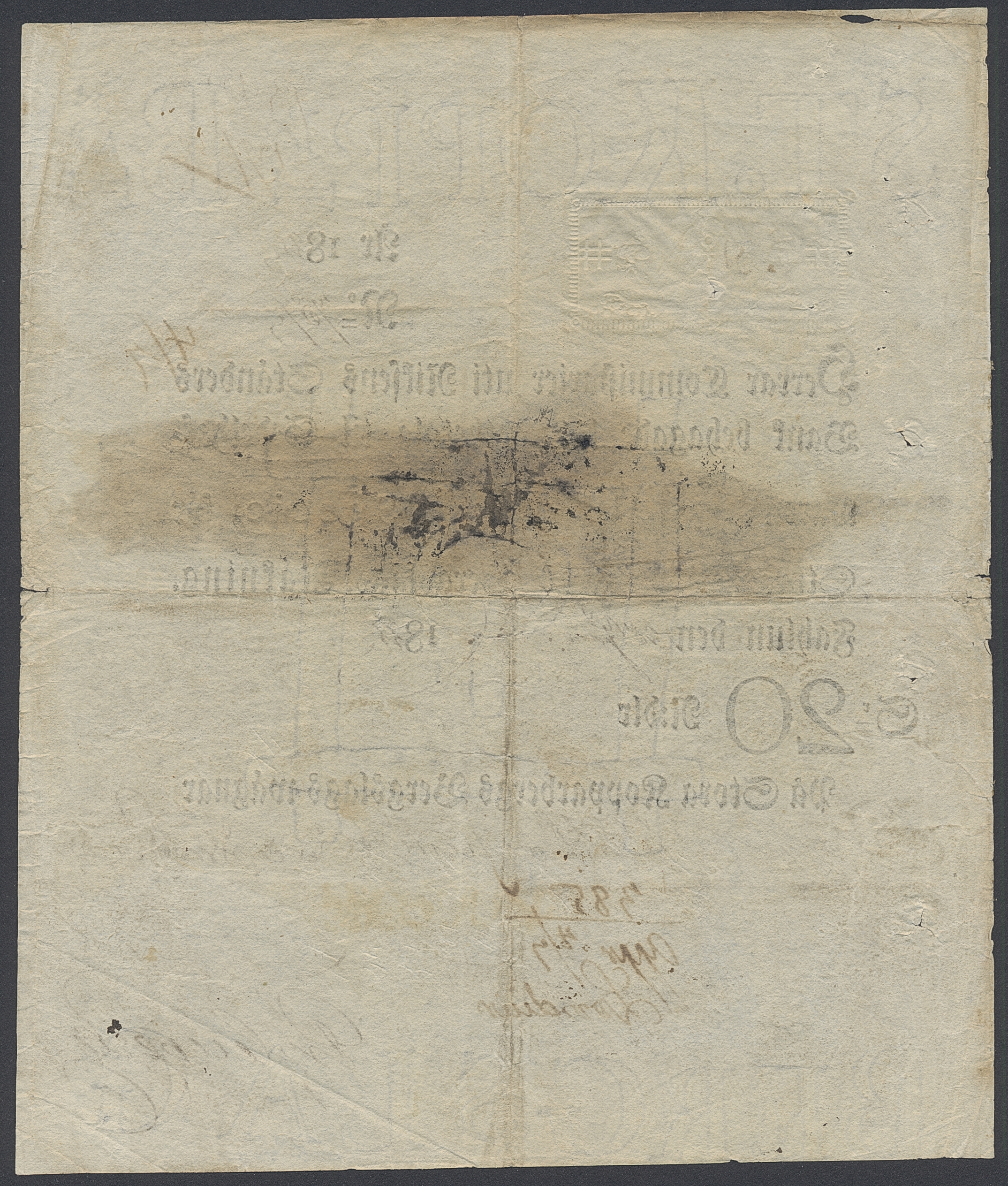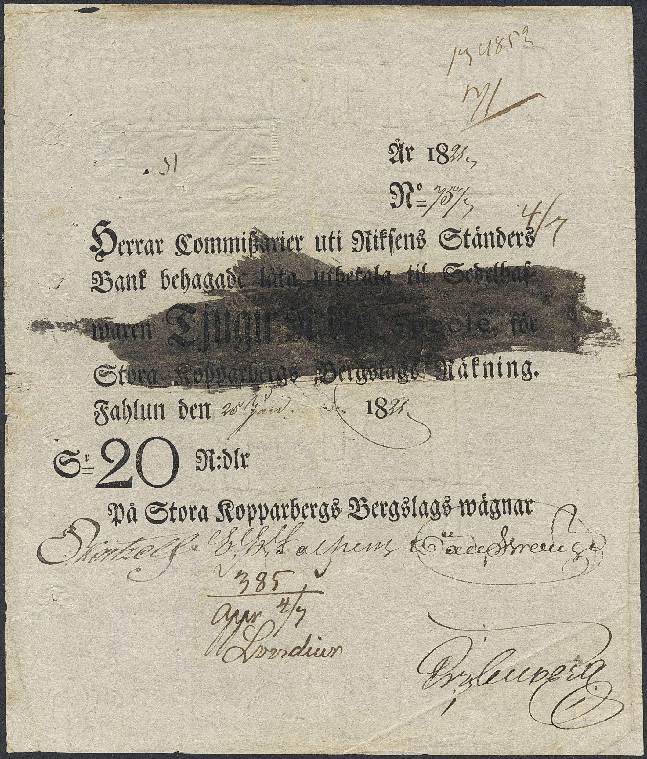 Banknotes, Sweden. 20 riksdaler specie 1821. Stora Kopparbergs Bergslag. Many pinholes, small tears. Ink cancelled. 1.