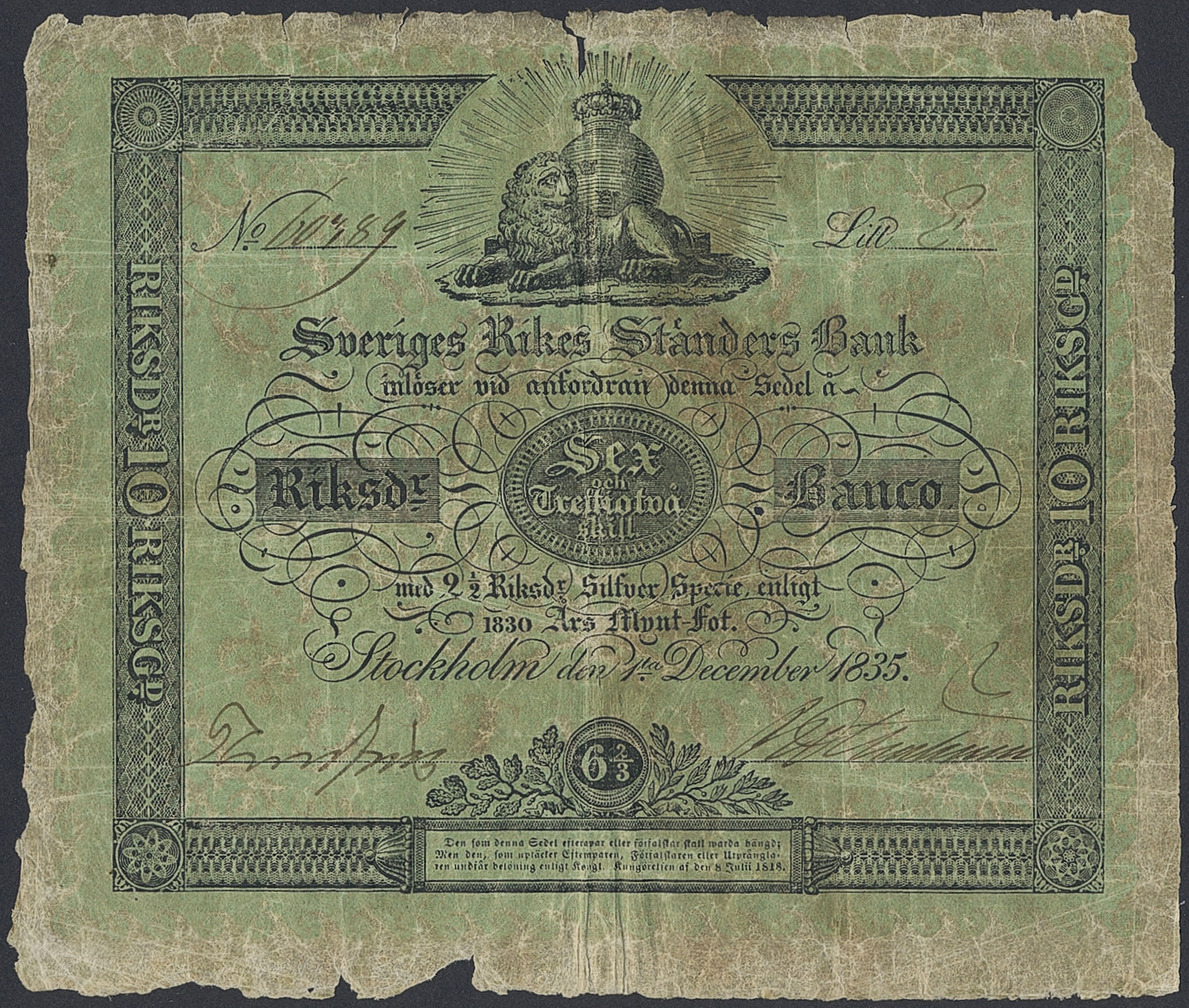 Banknotes, Sweden. SF C1:1, 6 2/3 riksdaler banco 1835. Litt E. No 60389. Some paper loss in upper right corner and lower margin. Small tears and pinholes, as well as a large tear in upper left corner. For this first scarce date it is a presentable example with quite fresh paper. 1?/1.