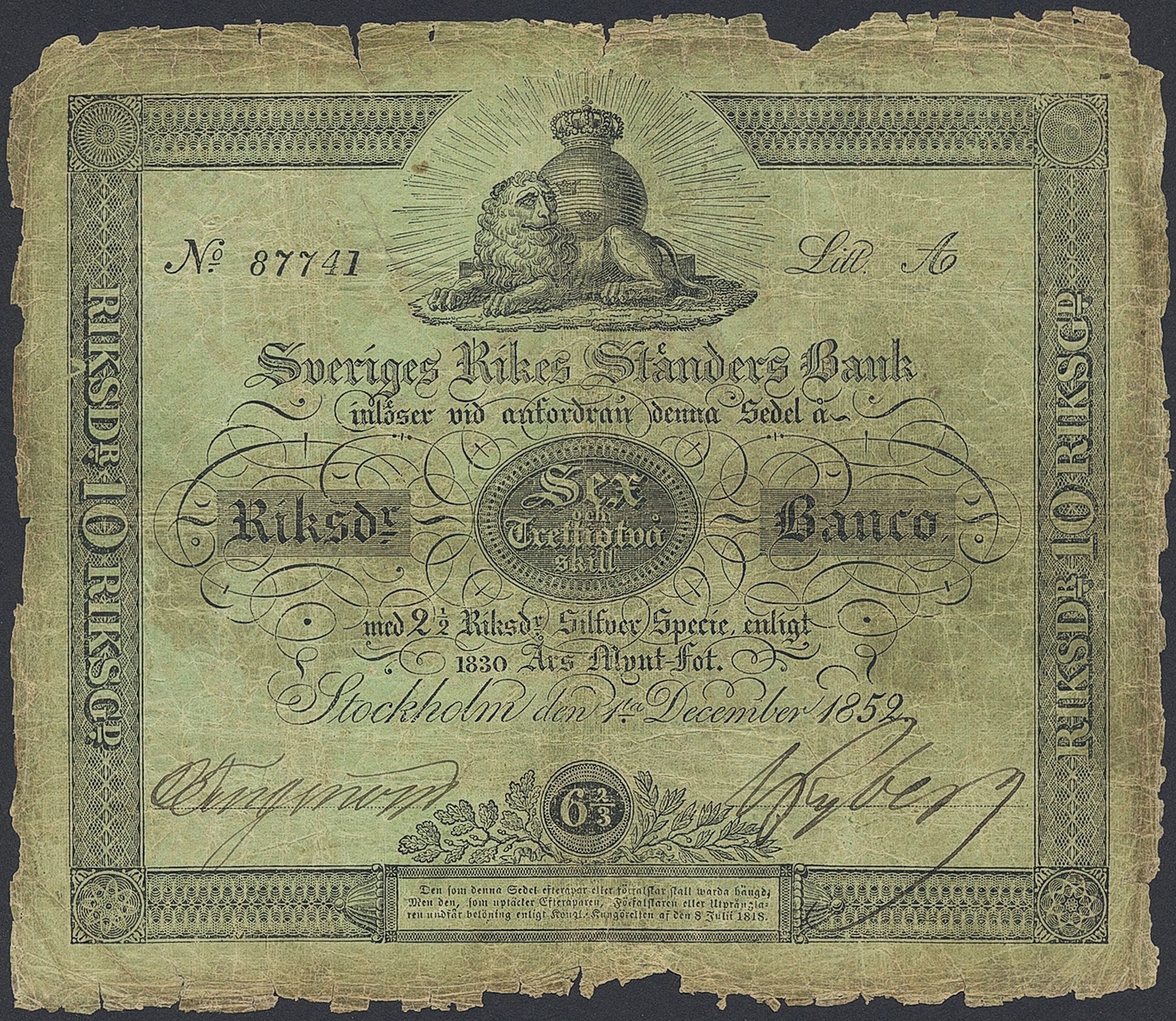 Banknotes, Sweden. SF C2:6, 6 2/3 riksdaler banco 1852. Litt A. No 87741. Some paper loss on edges as is common for the issue. Also some tears, but overall wholesome appearance. 1?/1.